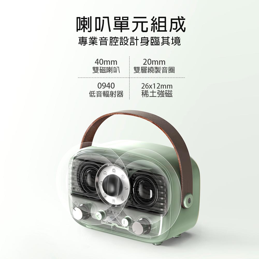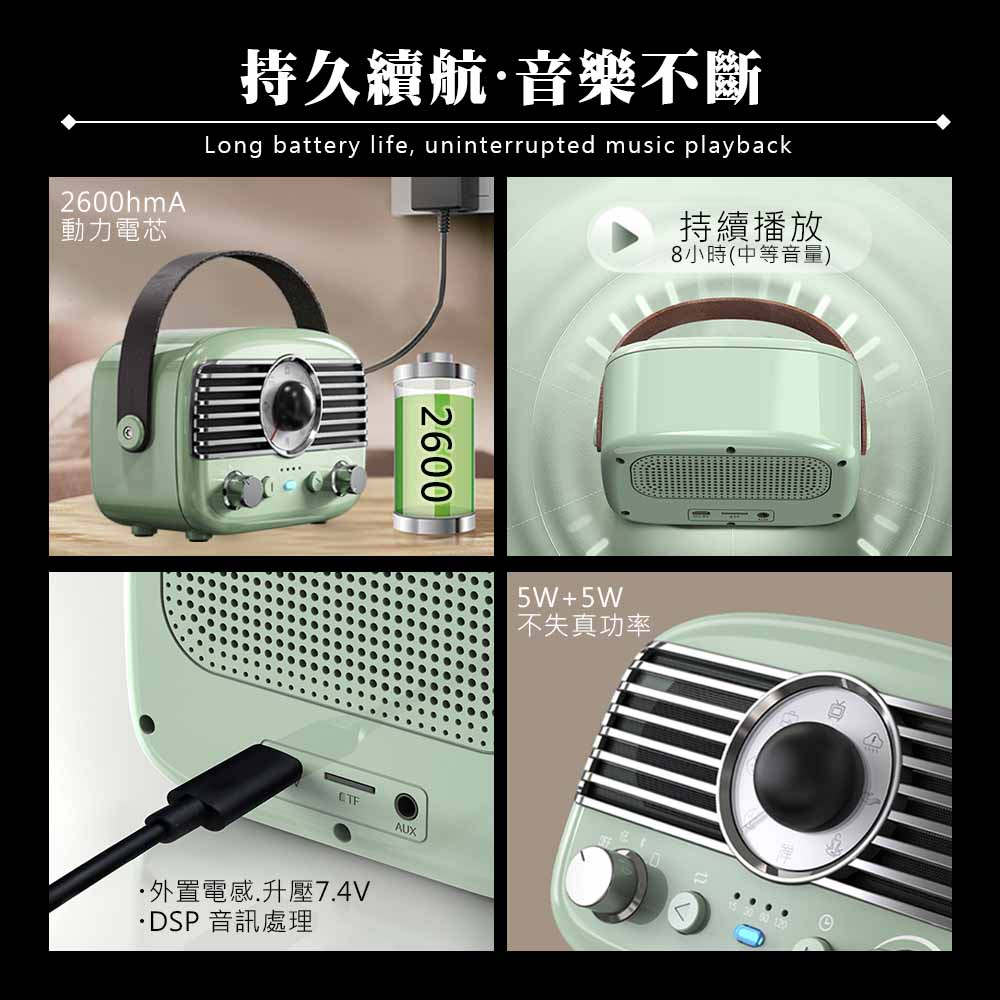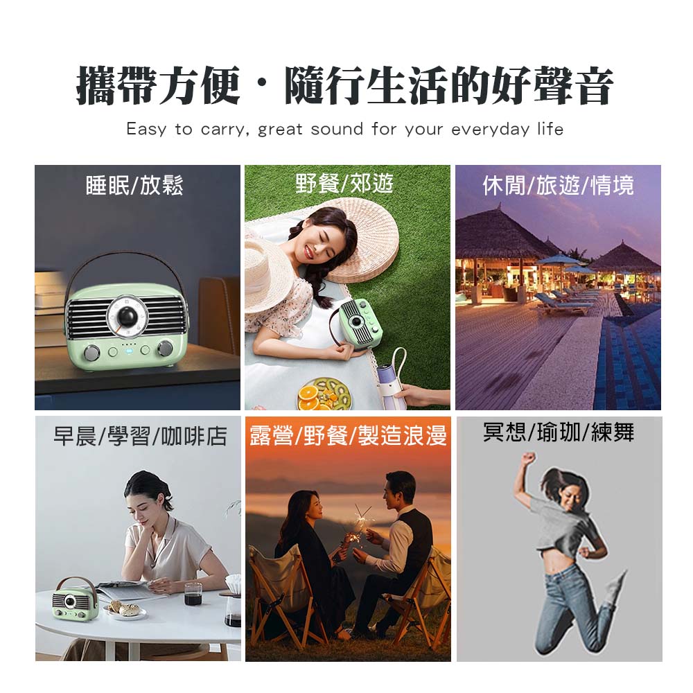 ●經典外型:機身質感有如鋼琴亮面,圓潤機身搭配金屬質感旋鈕,復古又時尚。一台融合復古與現代的便攜藍牙音響,隨時隨地,為生活注入溫柔旋律。