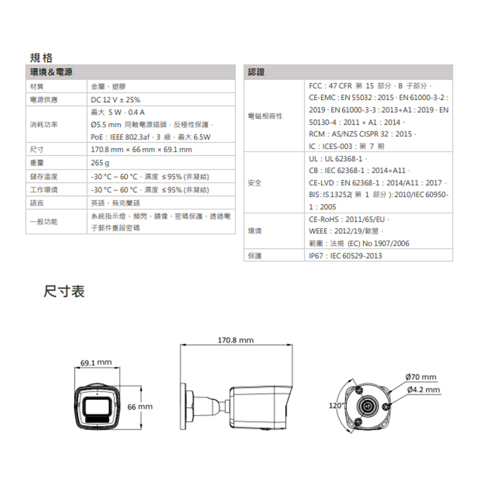 • 200百萬畫素,高品質影像• 支援人員和車輛偵測• 支援智慧雙光,提高安全性• H.265+ 編解碼、高效率壓縮• 內建麥克風 / IP67 防護等級
