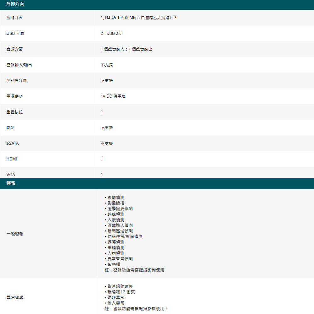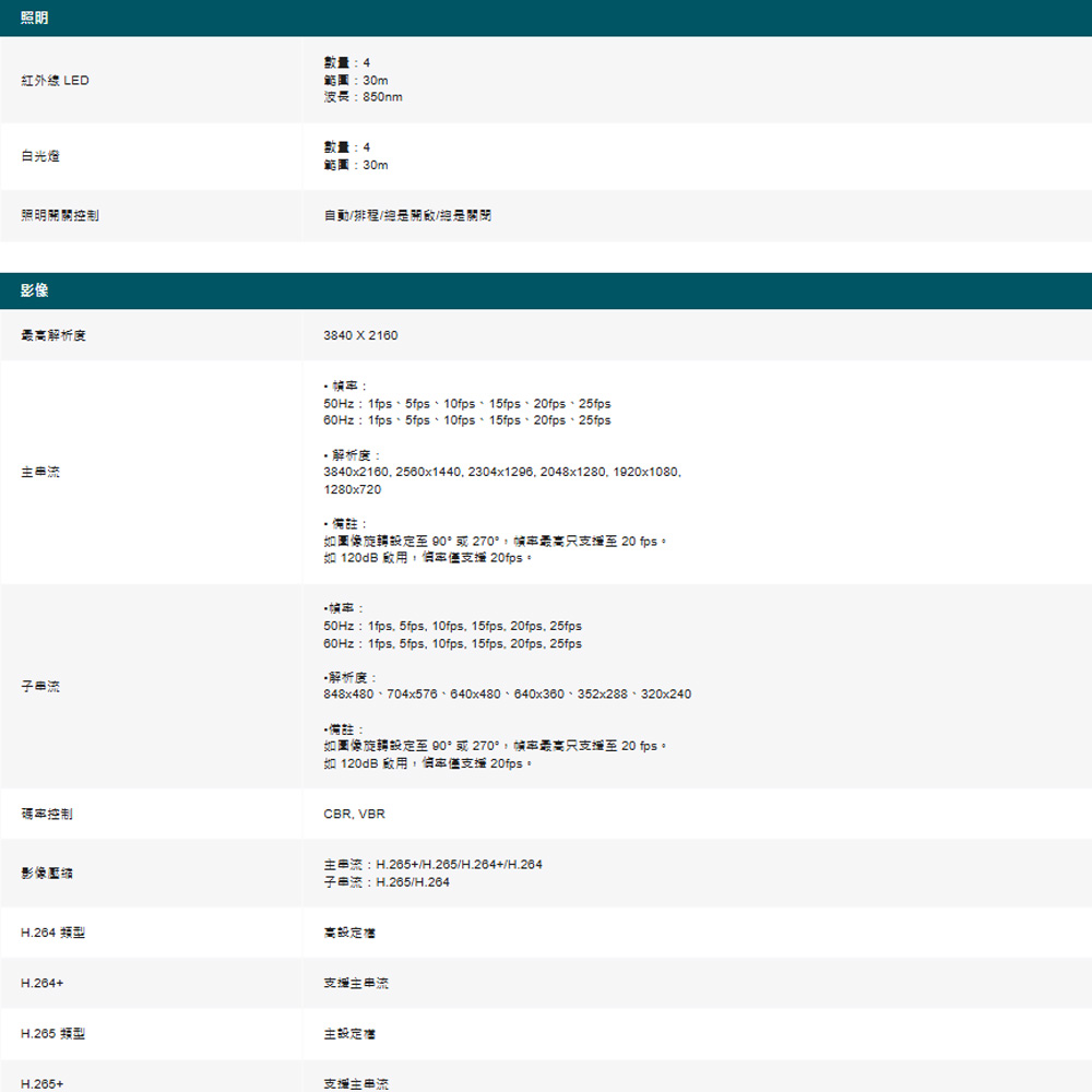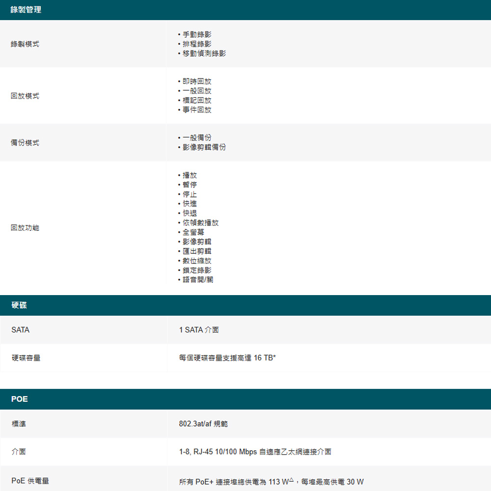 NVR1008H-8MP8 路即時畫面與 4K HDMI 影像輸出8× 10/100 Mbps PoE+ 連接埠,113 W PoE 總功率高達 8 路 @ 2MP (25fps) / 4 路 @ 4MP (25fps) 解碼能力8 路同時回放†80 Mbps 輸入頻寬和 60 Mbps 輸出頻寬1 個 SATA介面,最高支援 16 TB *H.265+ 壓縮技術HDMI 和 VGA 同時輸出遠端監控InSight S4854K (8MP) 超高 HD 畫質和全天候全彩人 & 車分析§人 & 車分類智慧偵測智慧影像強化技術主動防禦和雙向語音IP67 防水防塵H.265+ 壓縮技術