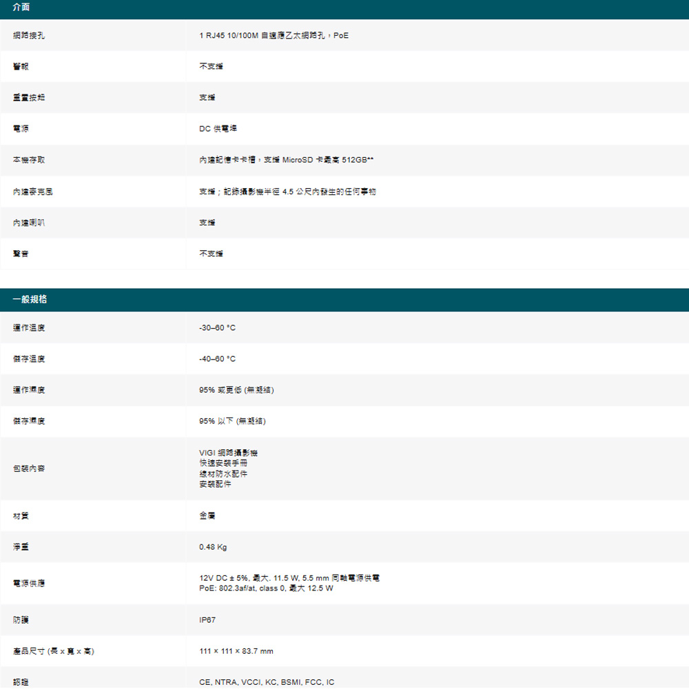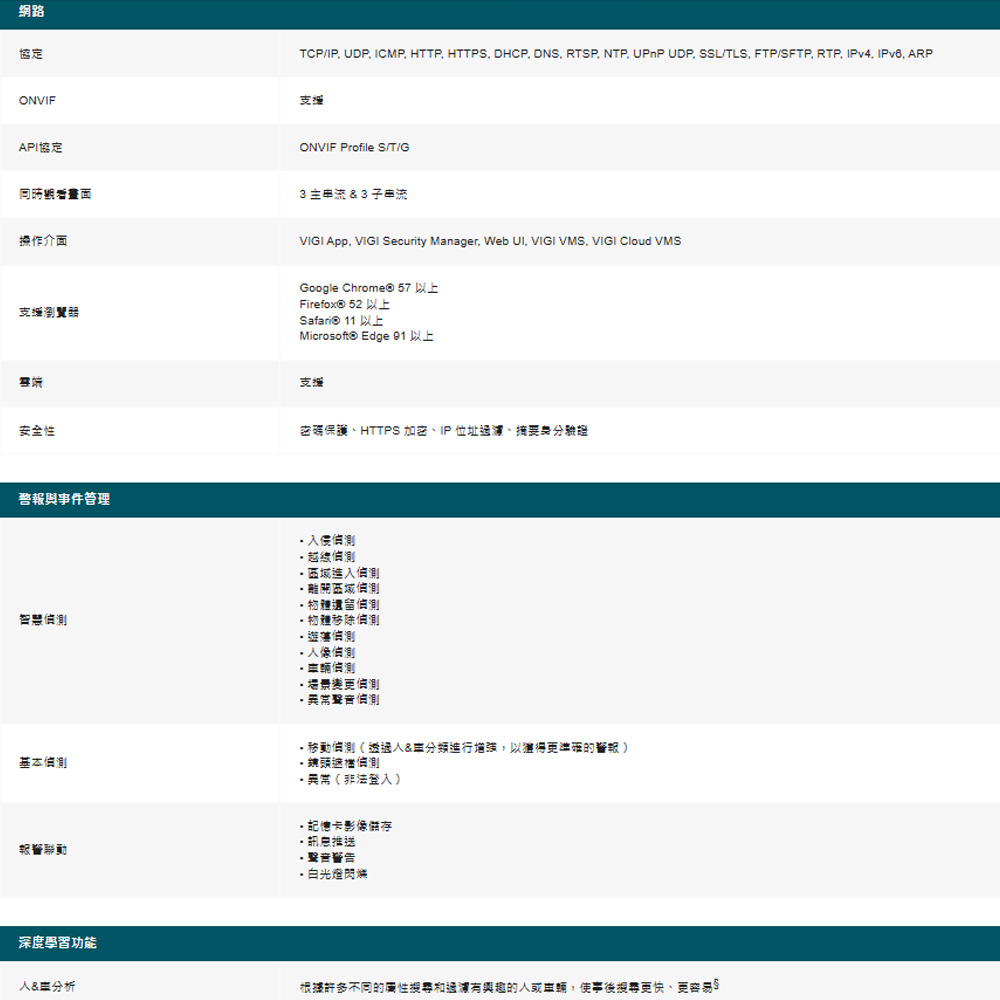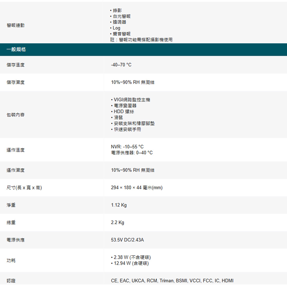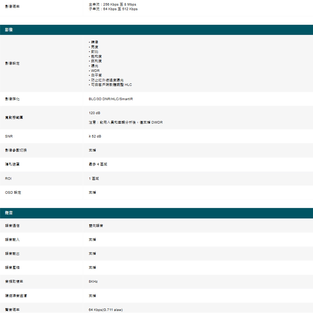 NVR1008H-8MP8 路即時畫面與 4K HDMI 影像輸出8× 10/100 Mbps PoE+ 連接埠,113 W PoE 總功率高達 8 路 @ 2MP (25fps) / 4 路 @ 4MP (25fps) 解碼能力8 路同時回放†80 Mbps 輸入頻寬和 60 Mbps 輸出頻寬1 個 SATA介面,最高支援 16 TB *H.265+ 壓縮技術HDMI 和 VGA 同時輸出遠端監控InSight S4854K (8MP) 超高 HD 畫質和全天候全彩人 & 車分析§人 & 車分類智慧偵測智慧影像強化技術主動防禦和雙向語音IP67 防水防塵H.265+ 壓縮技術