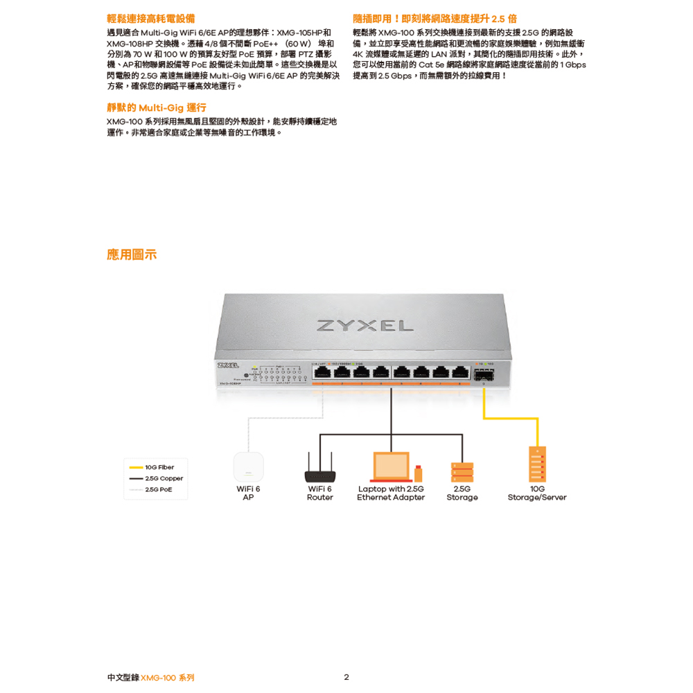 -即插即用,將您的網路升級至 WiFi 6/6EZyxel XMG-100 系列 2.5G Gigabit 無網管交換器包括 5 埠和 8 埠、PoE 和無 PoE 機型。 這些交換器配備Gigabit 連接埠,最高支援 2.5G 連線速度。具有 3 種連線速度 (100M/1G/2.5G) 自動協商功能,可優化網路設備的性能,包括 WiFi 6/6E AP、2.5G CPE、2.5G NAS/伺服器、4K 串流媒體、附2.5G 網路卡的桌上型電腦、遊戲機、VR 遊戲等。-額外提供 10G 連接埠,可靈活運用於大檔案傳輸10-Gigabit SFP+型號可提高網路速度,透過NAS和伺服器實現更快的上傳和下載,使內容創作者或自媒體人士能夠更有效率地工作。大檔案(例如高解析度影片或圖像)可以在更短的時間內傳輸,從而節省寶貴的製作時間。-單一電纜可同時供電和資料傳輸PoE 型號配備 4 或 8 個不間斷 PoE++ (60W) 連接埠以及經濟實惠的 70W 或 100W PoE 供電,部署 WiFi 6/6E AP、PTZ 攝影機和 IoT 設備等 PoE 設備從未如此簡單!-2.5G 超快速度,無需重新佈線您可以使用目前的 Cat 5e 電纜將家庭網路速度從 1Gbps 提高到 2.5Gbps,從而無需進行任何昂貴的重新佈線。-無聲的運轉和靈活的部署XMG-100 系列採用堅固的無風扇設計,可實現穩定、安靜的運行,非常適合家庭或工作室的無噪音環境。其精巧的設計,提供了可以放置在桌上或壁掛的靈活性。