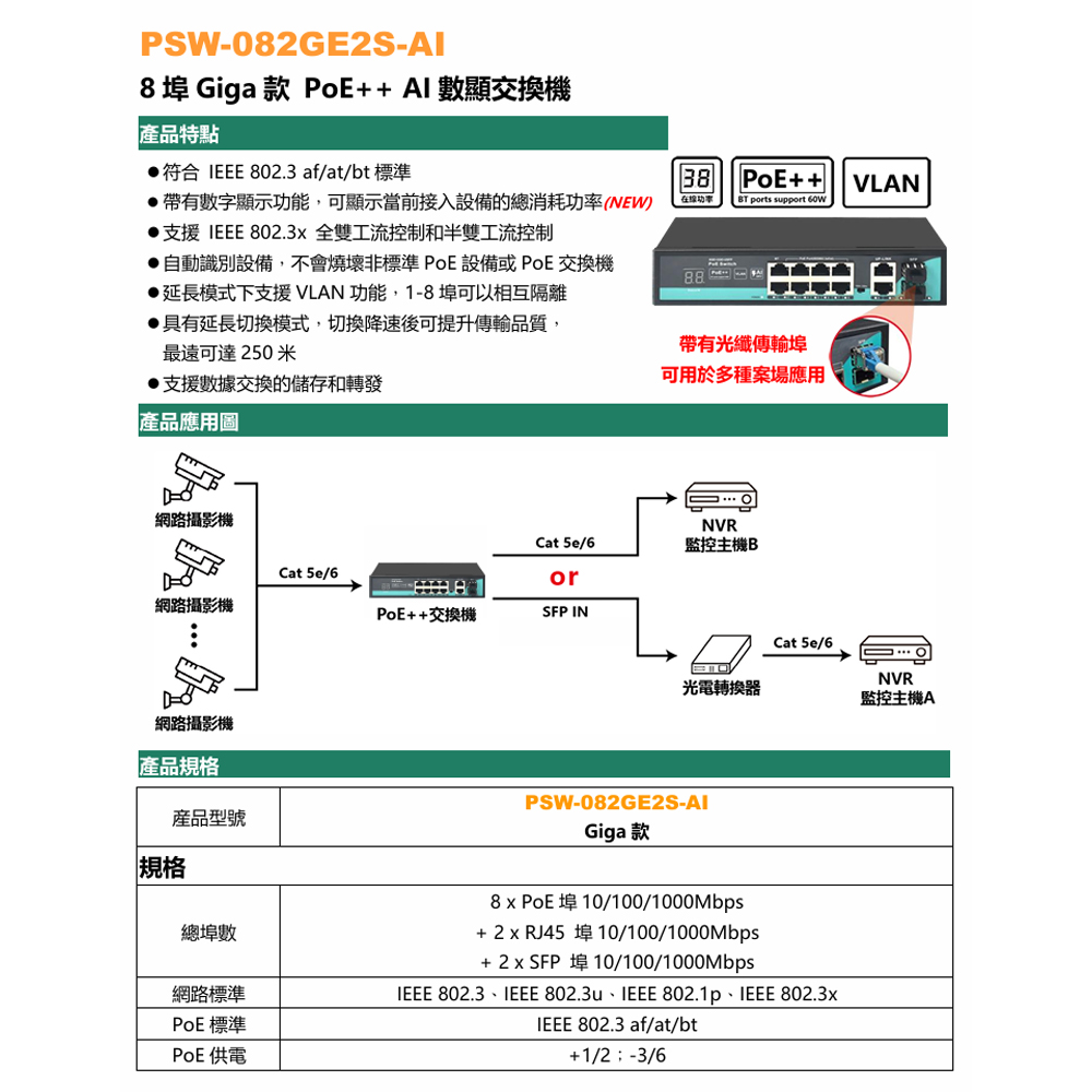 昌運監視器 PSW-082GE2S-AI 8埠 Giga款 PoE++ AI數顯交換機 (帶2埠SFP光模組)