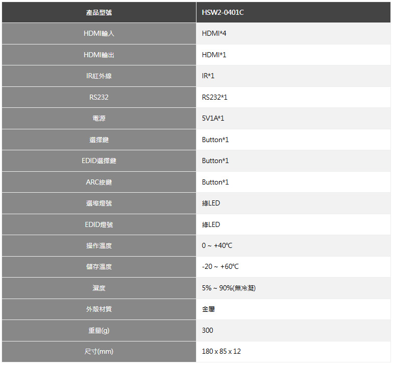 昌運監視器 HSW2-0401C 4埠HDMI切換器 支援最高顯示解析度4K@60Hz 支援3D畫面格式 支援ARC