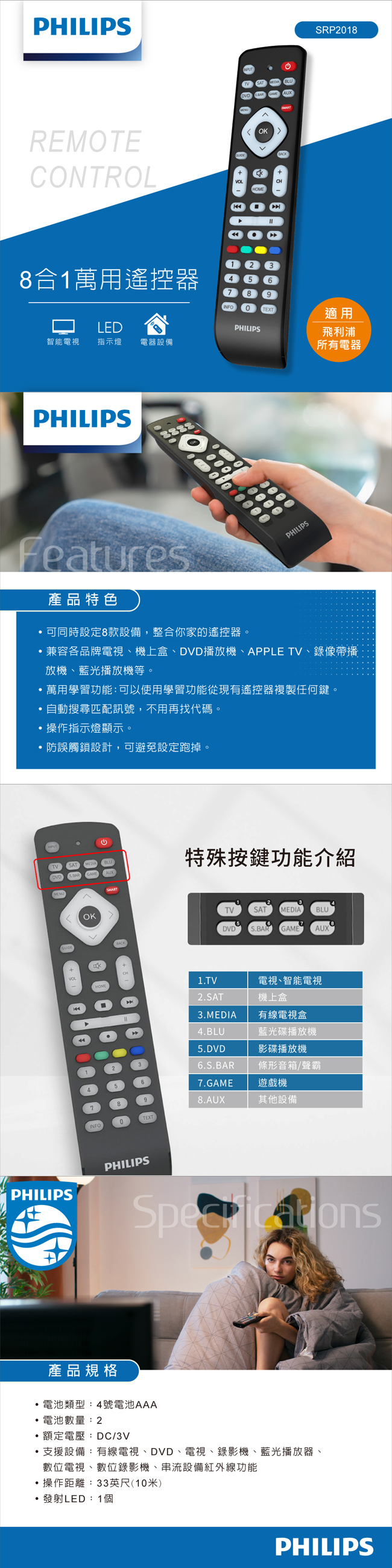 [PHILIPS] 飛利浦 8合1萬用遙控器-SRP2018