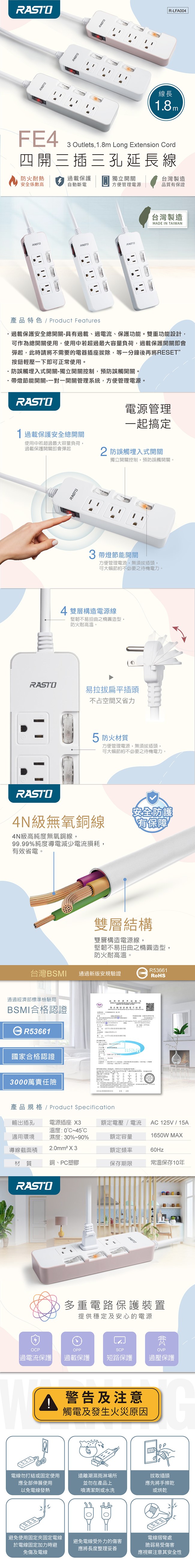 [ RASTO ] FE4 四開三插三孔延長線 1.8M-白