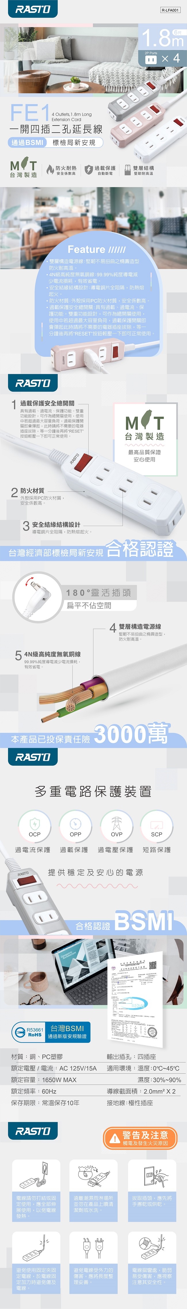 [ RASTO ] FE1 一開四插二孔延長線 1.8M-白
