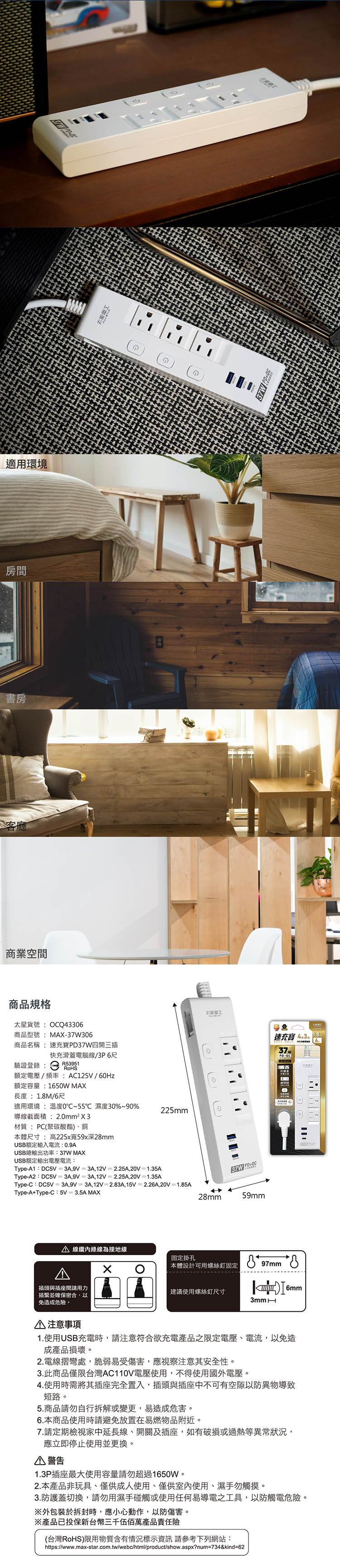 ◆商品規格與尺寸商品尺寸:(高)22.5x(寬)5.9x(深)2.8/公分包裝尺寸:(高)33.9x(寬)14x(深)7.5/公分商品重量:0.45kg包裝重量:0.54kg額定電壓 / 頻率 : AC125V/60Hz額定容量 : 1650W MAX長度 : 1.8M/6尺USB額定輸入電流 : 0.9AUSB總輸出功率:37W MAXUSB額定輸出電壓電流:Type-A1: DC5V☆3A,9V☆3A,12V☆2.25A,20V☆1.35AType-A2: DC5V☆3A,9V☆3A,12V☆2.25A,20V☆1.35AType-C: DC5V☆3A,9V☆3A,12V☆2.83A,15V☆2.26A,20V☆1.85AType-A+Type-C: DC5V☆3.5A MAX適用環境 : 溫度0☆C~55☆C 濕度30%~90%導線截面積 : 2.0mm2X3材質 : PC(聚碳酸酯)、銅驗證登錄:R53951 RoHS商品型號:MAX-37W306原產地:中華民國 台灣◆商品特色1.智慧高速快充:‧PD37W 高速快充,智慧分流。‧Type A+Type C 二種接孔,充電多元化,節能省電省時。2.安全防護蓋:‧滑蓋遮蔽防護,保護幼童誤觸安全。‧未使用時遮蓋,防止灰塵異物掉入,避免導電不良。3.按壓式開關:預防誤觸開關,確保用電正常。4.雙重功能安全總開關:‧總開關使用:電源總管理,一鍵即可管理所有電源,快速便利又安全。‧過載保護開關:具有過載、過電流保護功能。5.雙層構造電源線:堅韌不易扭曲之橢圓造型,防火耐高熱。6.易拉拔省力插頭:拔取插頭時只須輕拉拉環即可,扁平插頭不佔空間。7.掛壁孔設計:後方有壁掛孔,讓空間機能運用上更靈活。8.防火材質:外殼PC防火材質,耐熱溫度高,安全係數高。9.產品已投保新台幣三千伍佰萬產品責任險。適用:臥室、客廳、廚房、廁所、飯店、走廊、辦公室等室內場所。