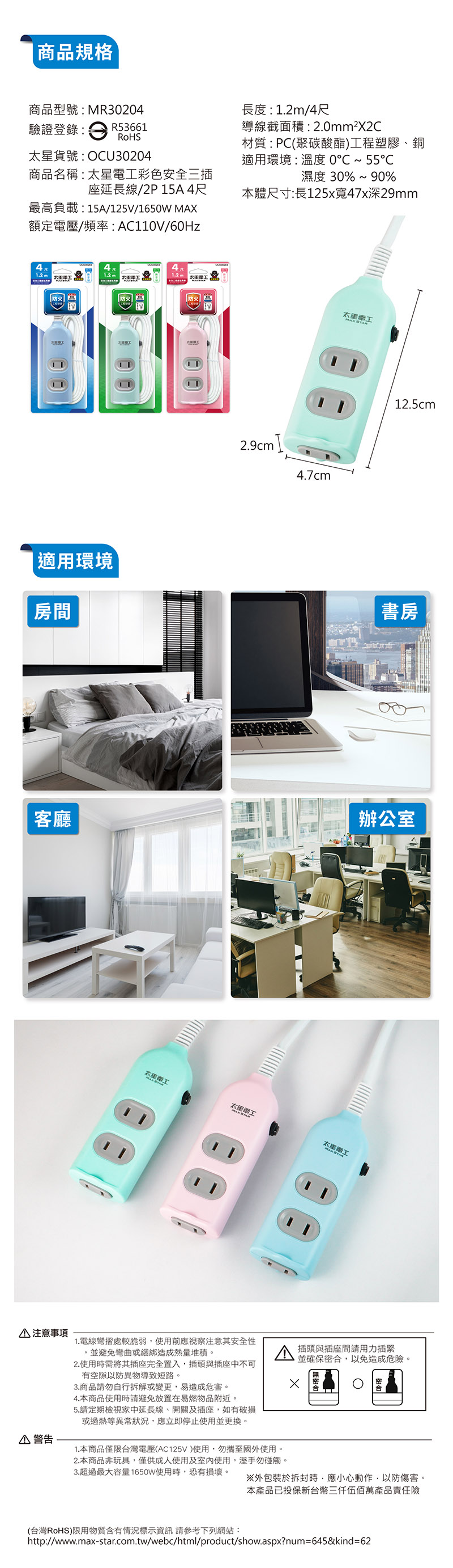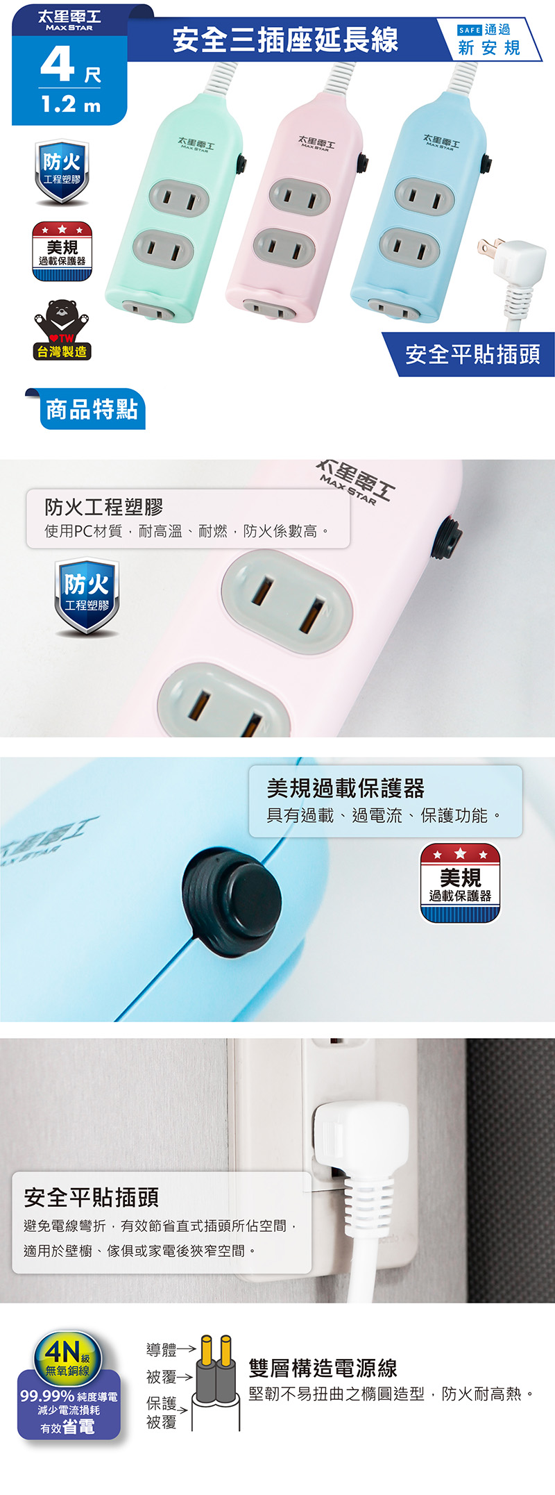 ◆商品特色1.使用PC防火工程塑膠,耐高溫、耐燃,防火系數高。2.使用美規過載保護器具有過載、過電流保護功能,電器使用更安全。3.安全平貼插頭,避免電線彎折,有效節省直式插頭所佔空間,適用於壁櫥、 傢俱或家電後狹窄空間。4.4N級無氧銅99.99%純度導電,減少電流損耗,有效省電。5.雙層構造電源線,堅韌不易扭曲之橢圓造型,防火耐高熱。6.台灣生產製造,品質有保障。7.本產品已投保新台幣三仟伍佰萬產品責任險。◆商品規格與尺寸商品尺寸 : (高)12.5x(寬)4.7x(深)2.9/公分包裝尺寸 : (高)22.8x(寬)9.5x(深)5/公分商品重量 : 0.184kg包裝重量 : 0.221kg最高負載 : 15A / 125V / 1650W MAX額定電壓/頻率 : AC110V/60Hz長度 : 1.2m/4尺導線截面積 : 2.0mm2X2C材質 : PC(聚碳酸酯)工程塑膠、銅驗證登錄 : R53661 RoHS商品型號 : MR30204商品原產地:中華民國 台灣顏色:粉籃、粉綠、粉紅 隨機出貨