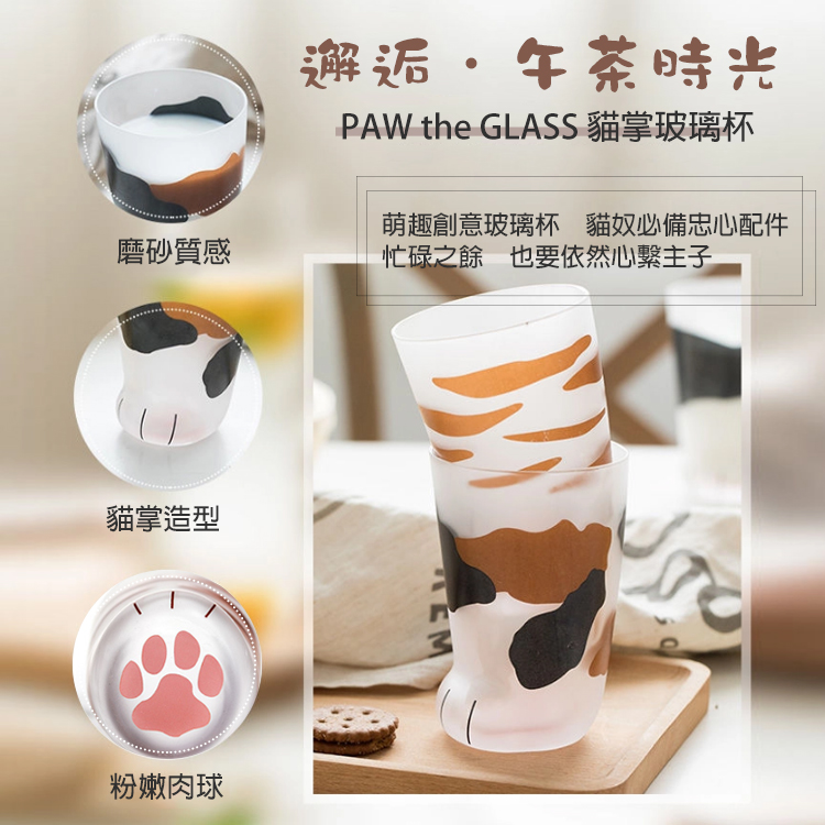 【瘦貓掌-300ml】材質:水晶玻璃尺寸:杯口7.5*7.5cm 杯身高10.5cm 杯底5*6cm淨重:80g容量:300ml 【胖貓掌-400ml】材質:水晶玻璃尺寸:杯口8.3*8.3cm 杯身高10.5cm 杯底7.7*7.5cm淨重:370g容量:400ml【貼心提醒】◎玻璃製品易碎,請小心存放。◎由於製程關係,偶有小氣泡不可避免, 但不影響整體美觀和使用。◎高硼矽耐熱玻璃的耐熱溫度較一般玻璃高 但需避免短時間的高溫差,以免因 熱漲冷縮的自然現象使得玻璃杯破裂。