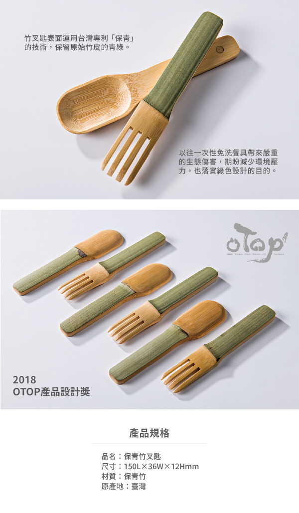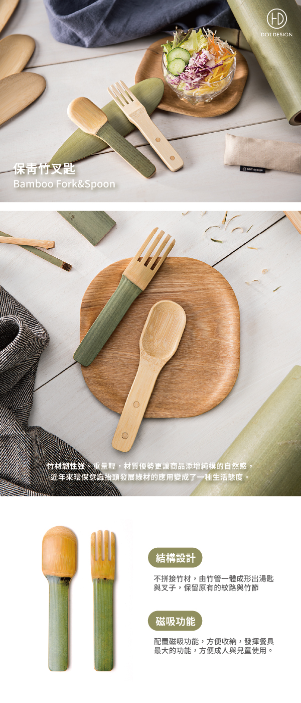 竹材韌性強、重量輕,材質優勢更讓商品添增純樸的自然感,近年來環保意識抬頭發展綠材的應用變成了一種生活態度。 竹叉匙表面運用台灣專利「保青」的技術,保留原始竹皮的青綠。 結構設計上,不拼接竹材,由竹管一體成形出湯匙與叉子,保留原有的紋路與竹節,並配置磁吸功能,方便收納,發揮餐具最大的功能,方便成人與兒童使用。 以往一次性免洗餐具帶來嚴重的生態傷害,期盼減少環境壓力,也落實綠色設計的目的。