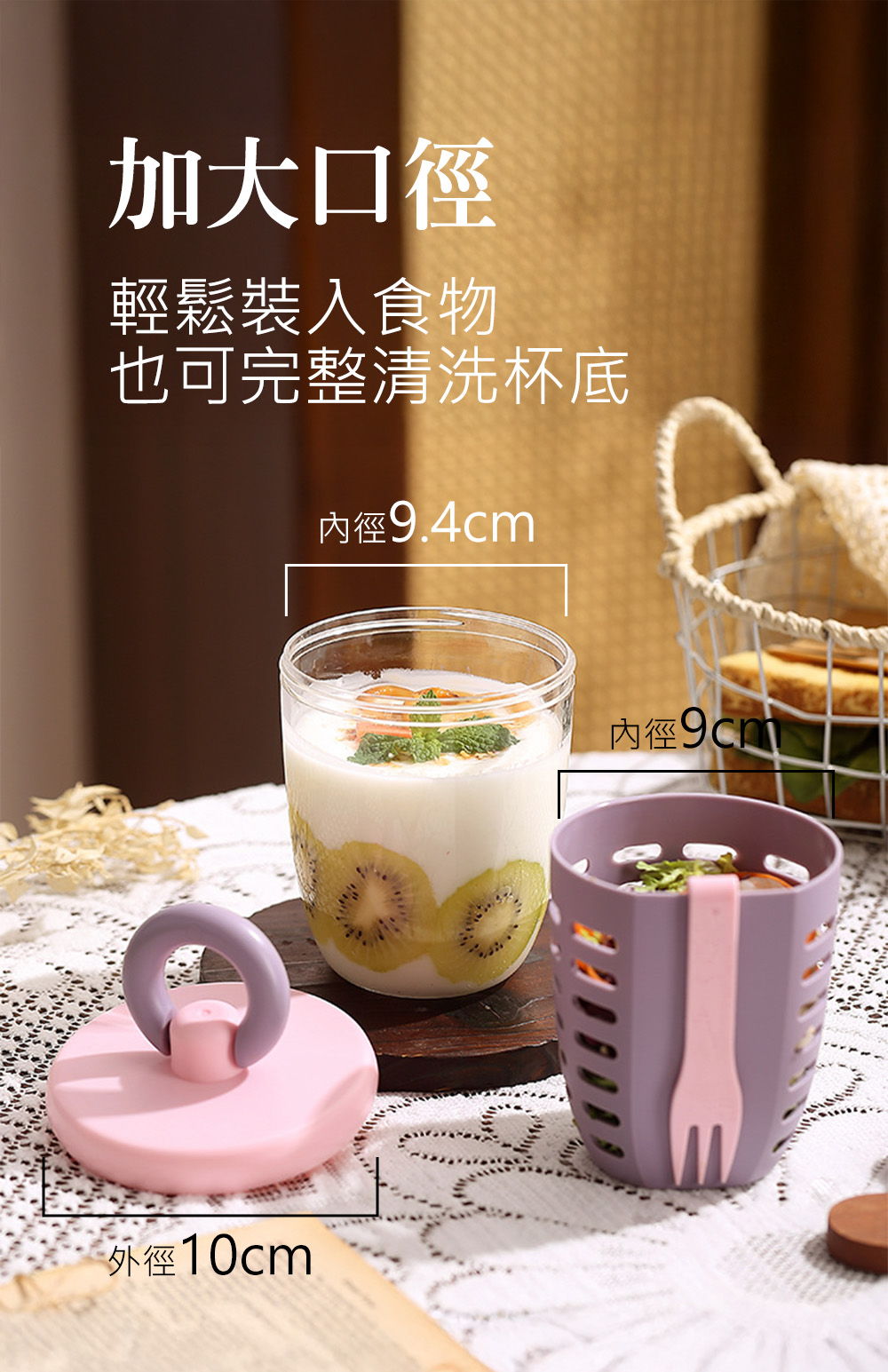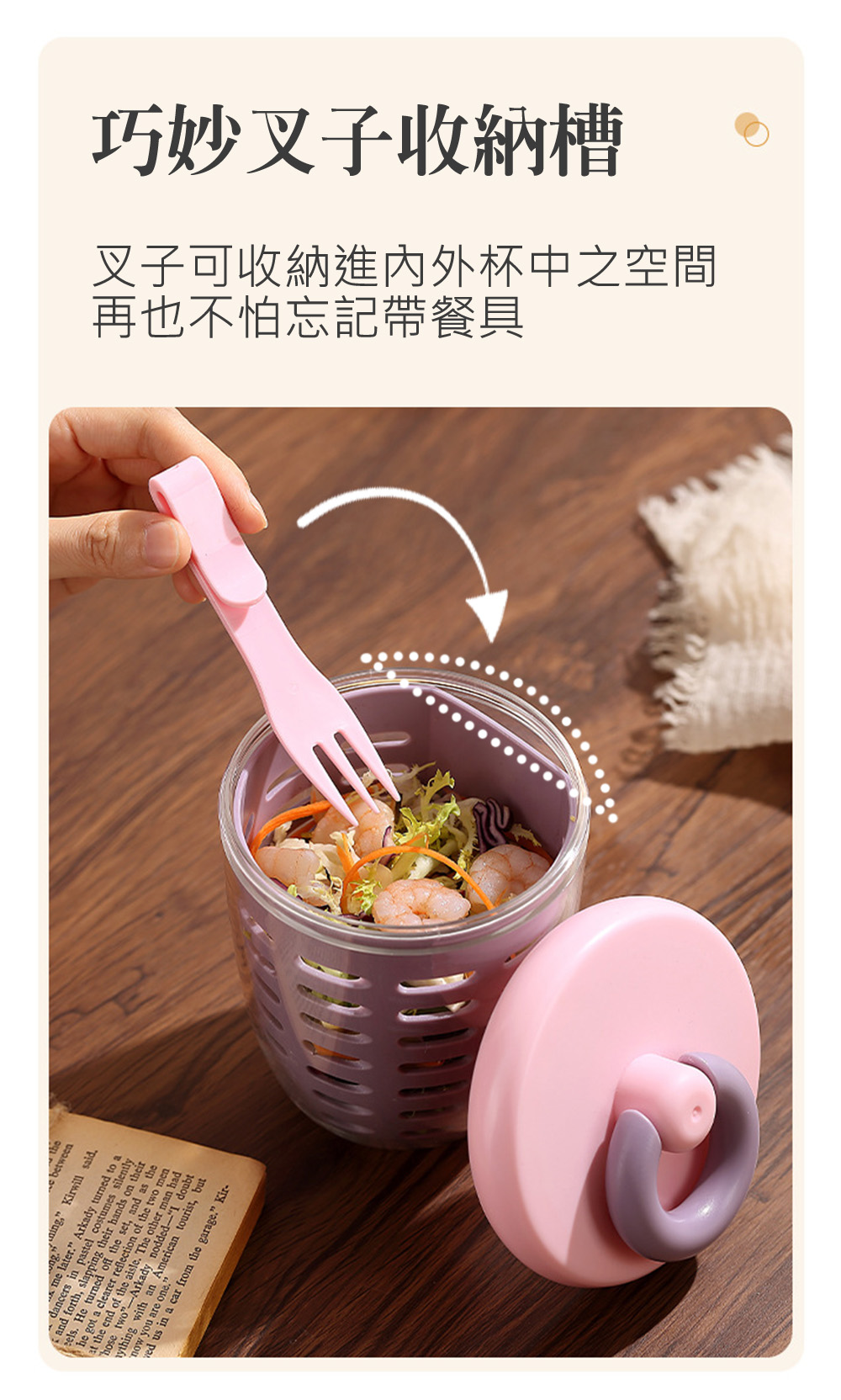 懶人一體設計:不用再翻找餐具,杯蓋自帶叉子與提環,提了就走,上班上課超優雅。
