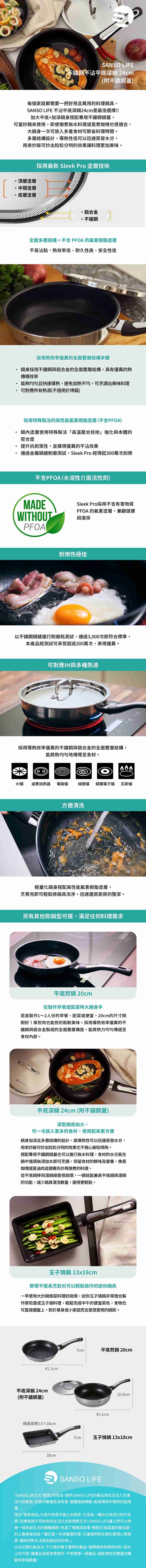 【SANSO LIFE】不鏽鋼不沾平底深鍋 24cm (附不鏽鋼蓋)