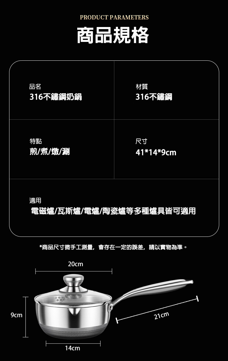 規格:20cm尺寸:如圖片所示材質:316不銹鋼容量:2200ml適用人數:2-3人重量:980g產地:中國材積:23.5*22*21cm