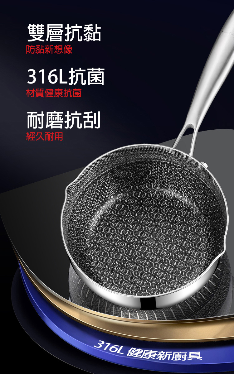 ● 316不鏽鋼材質● 蜂窩紋理 強效不沾● 雙面雕刻 快速導熱