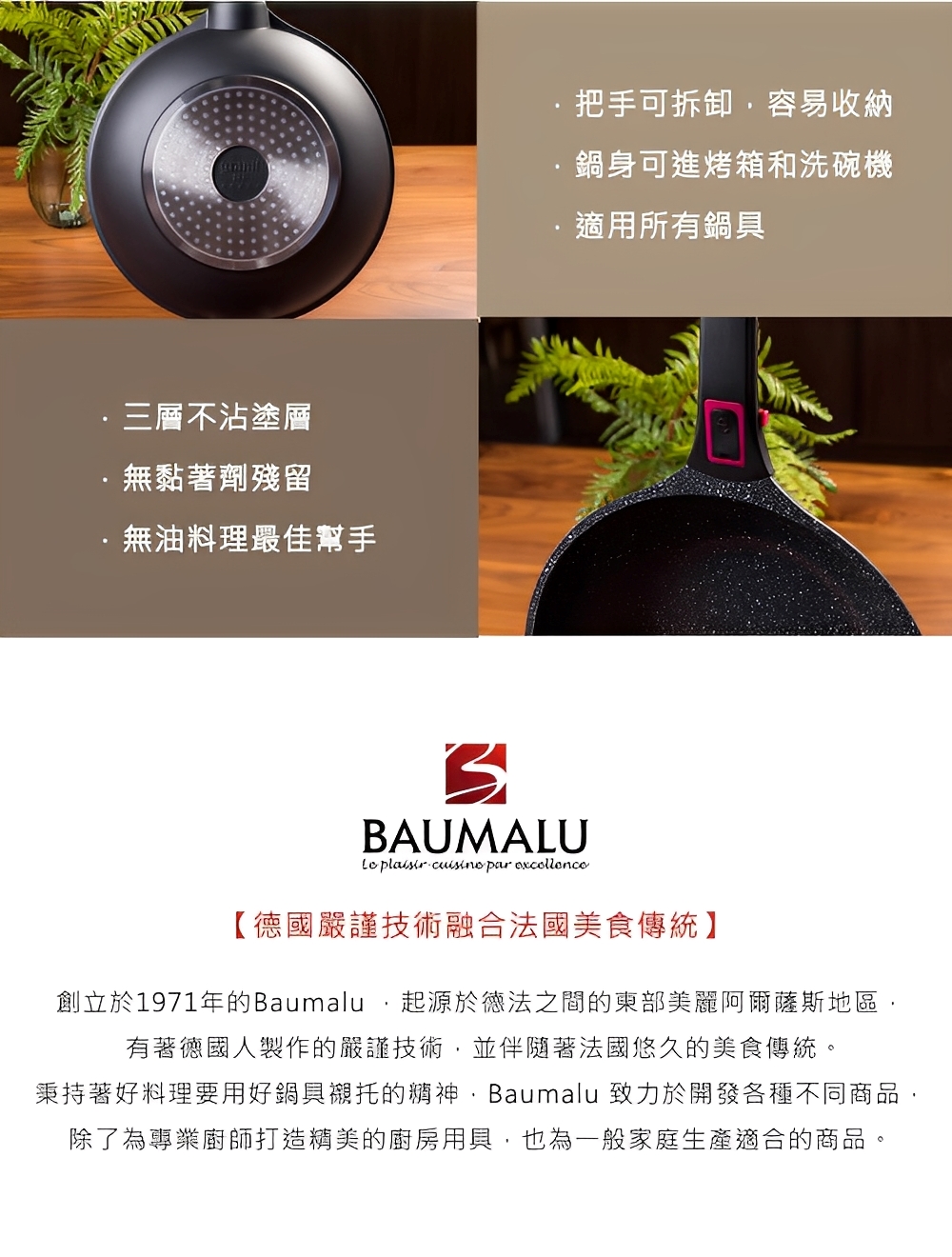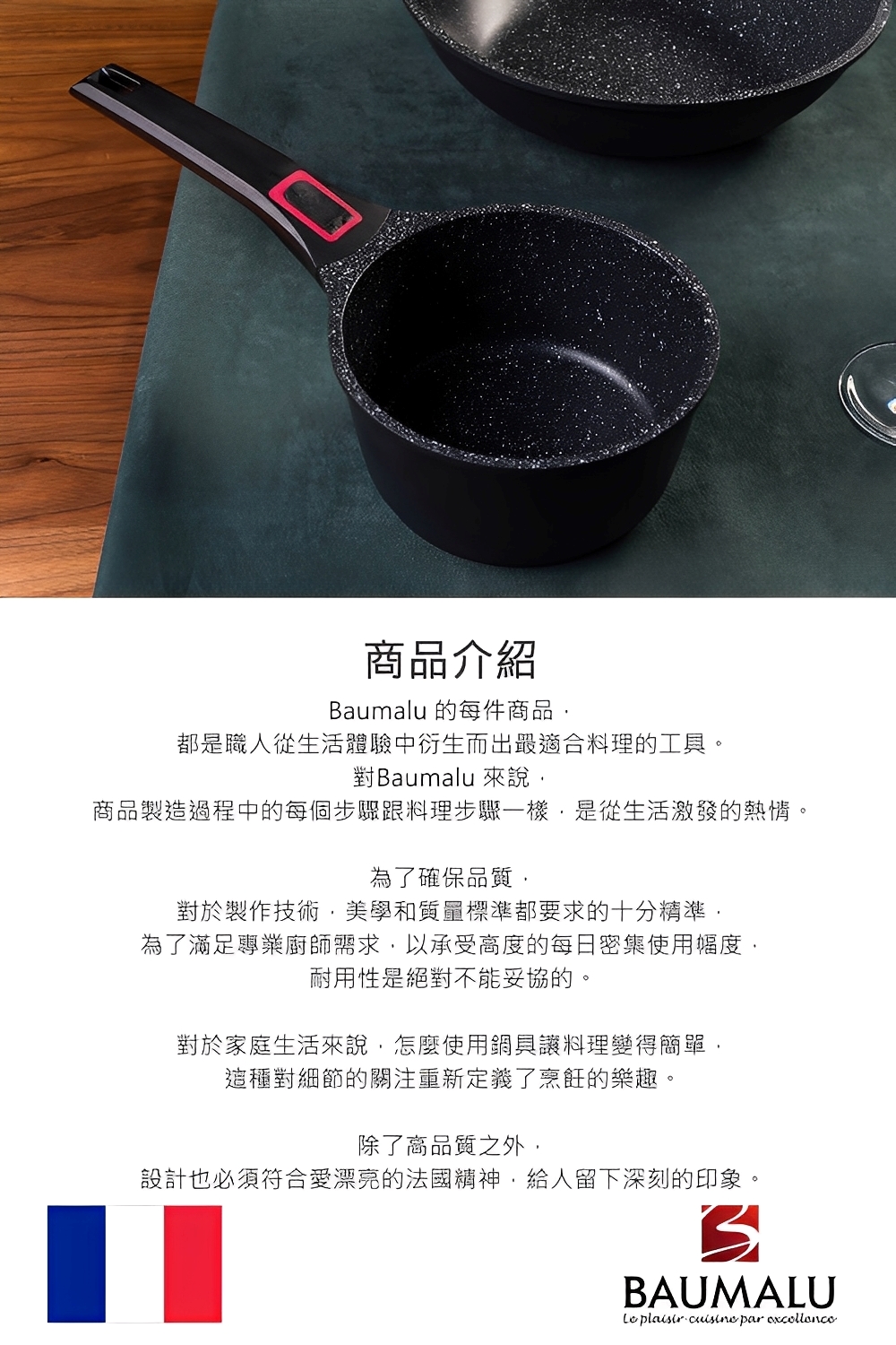 創立於1971年的Baumalu ,起源於法國東部美麗阿爾薩斯地區,位於德法之間的這個地區,Baumalu 有著德國人製作的嚴謹技術,並伴隨著法國悠久的美食傳統。秉持著好料理要用好鍋具襯托的精神,Baumalu 致力於開發各種不同商品,除了為專業廚師打造精美的廚房用具,也為一般家庭生產適合的商品。