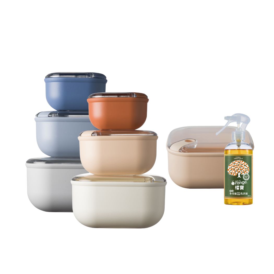 該組合內含方形三件組2組(日出色*1+天空色*1)+2L保鮮盒+瀝水墊+贈橘寶洗淨液300ML一罐