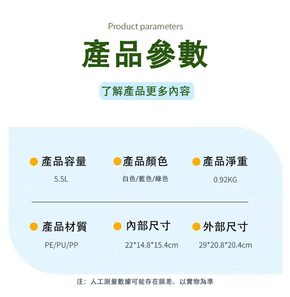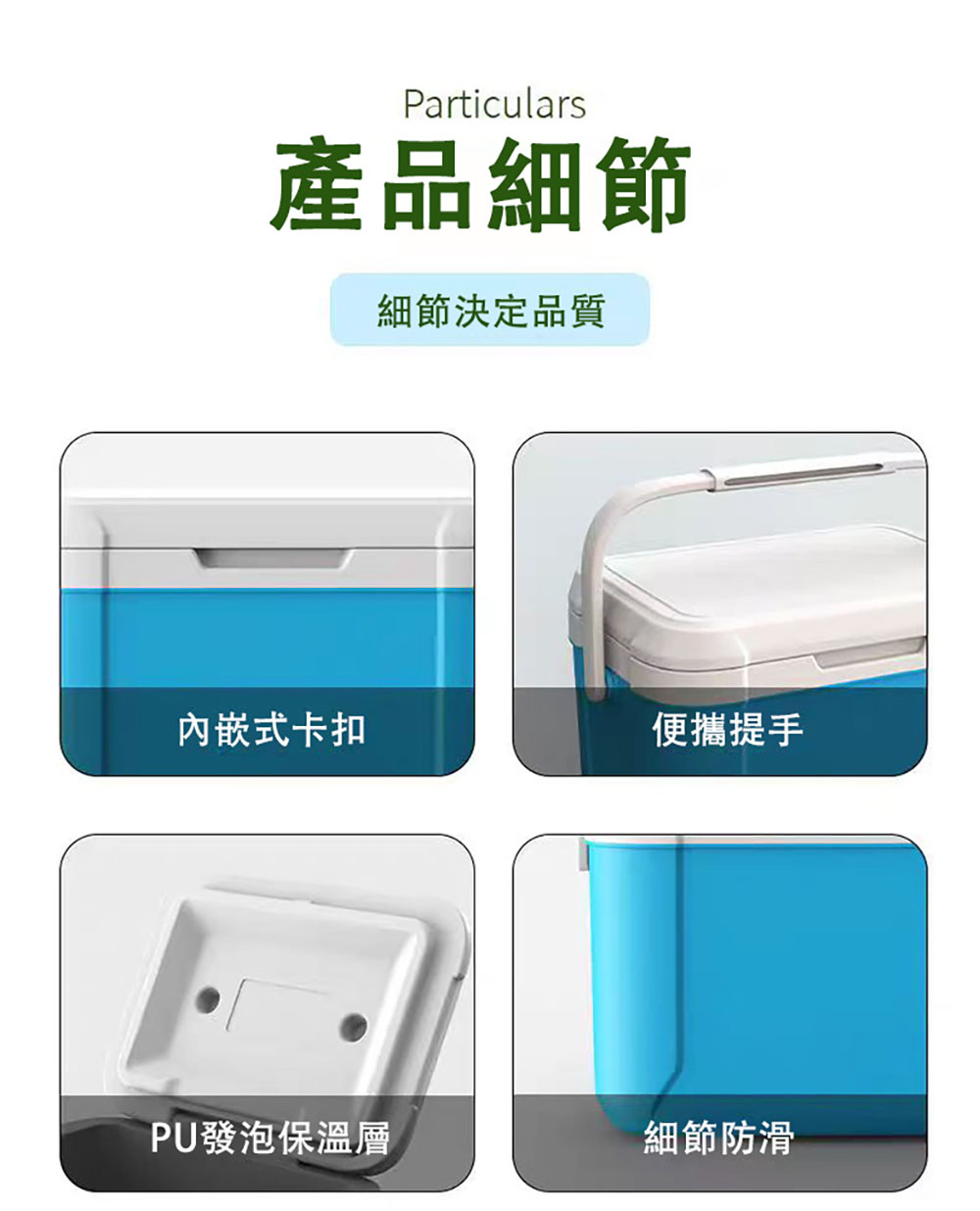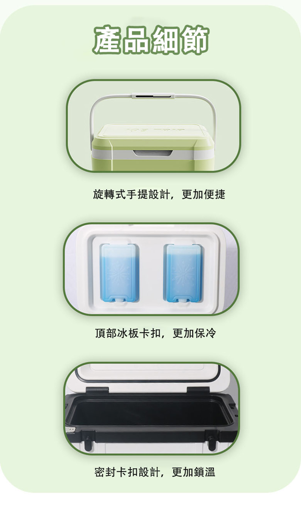 【露營必備|5.5L 大容量保溫箱】戶外野餐必備神器|48 小時保冷保鮮・食品級安心材質🌿不只保溫、保冷,我們的保溫箱直接讓戶外體驗升級🏆 食品級安全材質|PE/PU/PP 多層結構,無毒無味安心接觸食物🏆 48 小時長效鎖溫|PU 發泡隔熱層,保冷保熱雙重強效 輕便手提設計|防滑圓潤把手,長時間攜帶不勒手✨ 三合一鮮 / 冷 / 熱|野餐、露營、釣魚都適用無論是冰鎮飲料、保鮮食材,還是維持熱食溫度,一機搞定。內嵌式卡扣緊閉防漏,底部防滑設計穩固不晃,戶外使用更安心。📌 輕量設計僅 0.92KG|負擔再減輕📌 多色可選百搭風格|白色 / 藍色 / 綠色,輕鬆搭配你的露營裝備🎁 台灣露營圈網友狂推「戶外必備好物」|收納空間大、保溫效果超有感不僅適合露營、野餐,車載保溫、居家保鮮也能派上用場,一機多用超划算。🌟 為什麼露營玩家都選這款?✔ 食品級認證|品質把關更安心✔ 多層加厚 PU 鎖溫|保溫效果比傳統 EPS 材質強 3 倍✔ 輕便手提 + 防滑設計|攜帶移動超輕鬆✔ 5.5L 大容量|滿足 2-3 人戶外食材保鮮需求✔ 多場景適用|露營、野餐、釣魚、車載都好用
