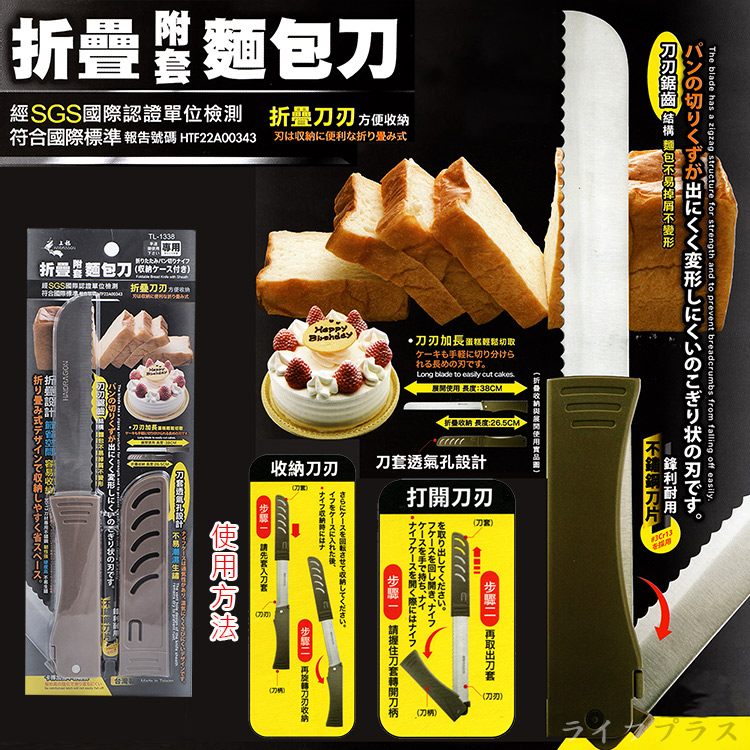 適用於麵包土司等食材處理,臺灣製造品質安心,通過sgs檢驗合格使用安心,採用不鏽鋼材質,比一般市售不鏽鋼刀具更加鋒利耐用,不易生鏽,使用完畢,用水輕輕沖洗,易於清洗,廚房好幫手,折疊設計節省空間,收納方便值得使用。