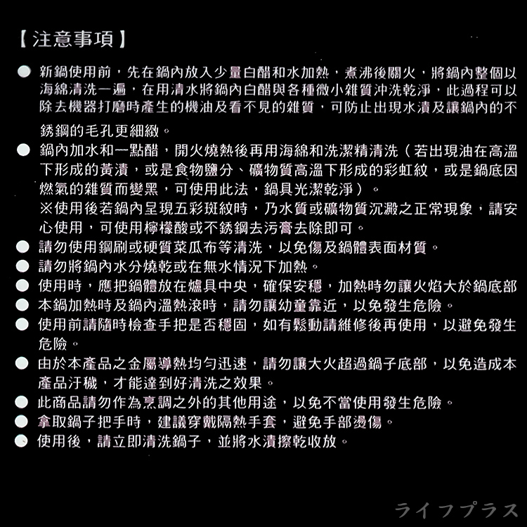 注意事項:嚴禁空燒。烹調後最好以隔熱手套拿取鍋蓋或鍋身,以免燙傷。