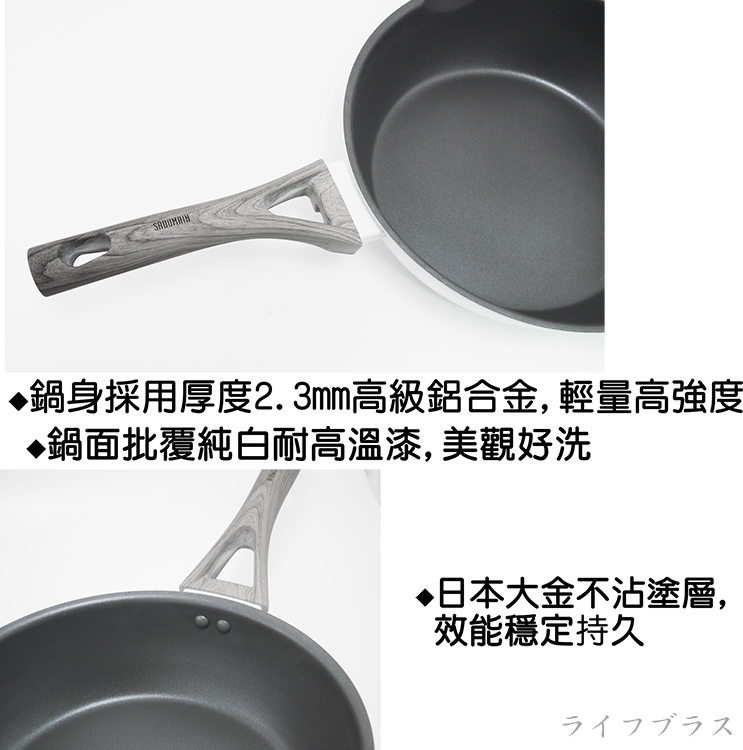 通過SGS材質檢驗標準,使用安心,鍋身採用厚度2.3mm合金,鍋身外面批覆純白耐高溫漆,外觀時尚妝點廚房,塗層採用日本大金不沾塗層,耐用不沾處理,煎煮食材只需少許油,達到食材不沾黏,易清洗,不留食物殘味,極輕量導熱更均勻,儲熱性佳,料理食物好鍋具,IH電磁爐對應設計,適用瓦斯爐、電爐、鹵素爐、紅外線爐,雅緻巧思美觀大方。