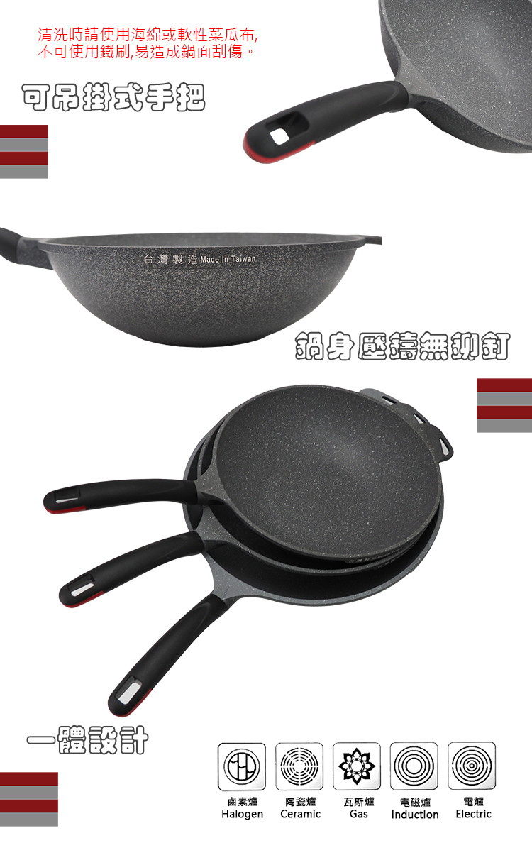 台灣製造品質安心,通過SGS檢測品質安心,ISO9001認證,輕量設計採用最新合金精工製作,耐用不沾塗層處理,導熱更均勻,省油,省瓦斯,煎煮食材只需少許油,達到不沾鍋身抗黏OK,不易粘黏食材,鍋身無鉚釘設計易清洗 ,深型化設計,適用圓角金屬鍋鏟,料理食物好鍋具,導磁片設計,適用IH電磁爐、瓦斯爐、電爐、陶瓷爐、鹵素爐,不挑爐的好鍋。