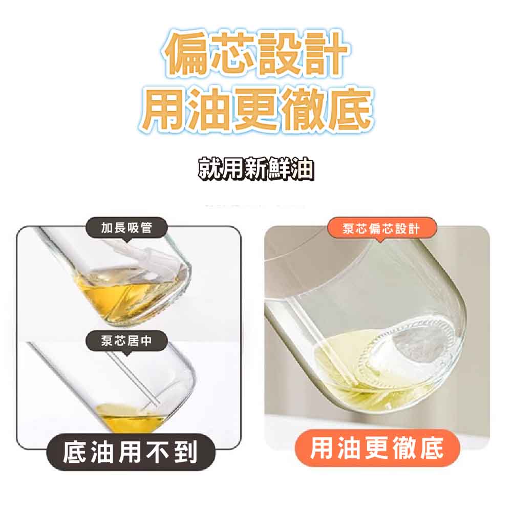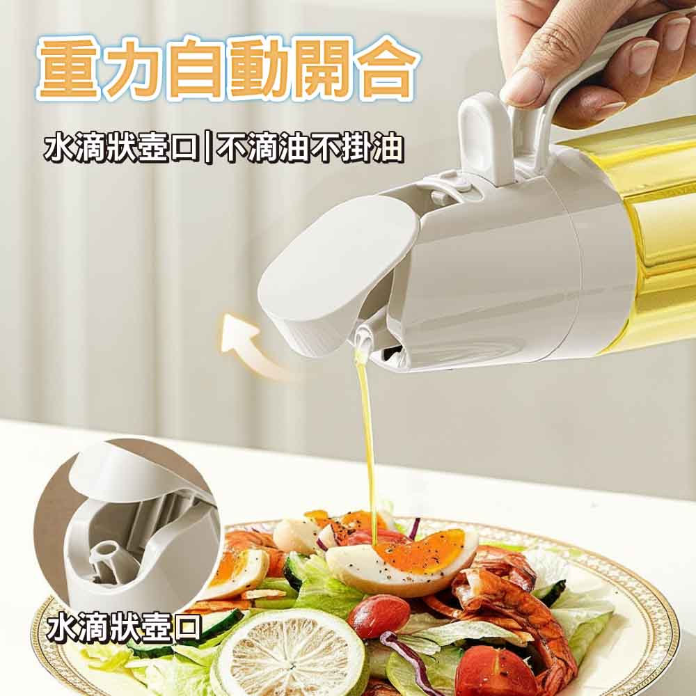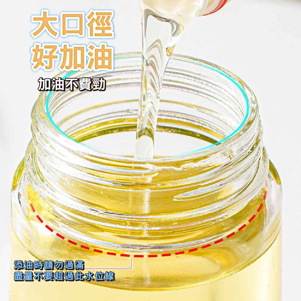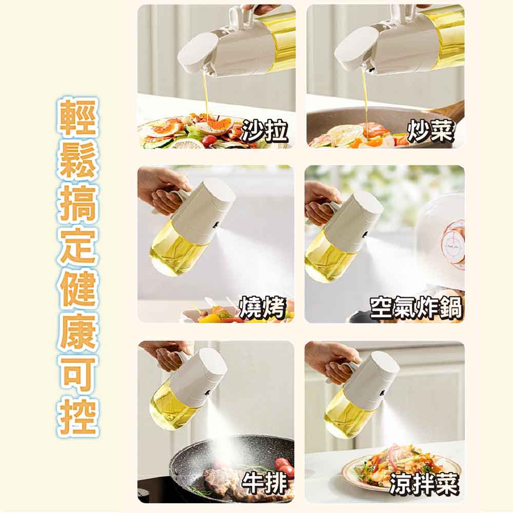 2合1噴油倒油設計,靈活方便高硼矽玻璃瓶身,安全耐熱精準控油,享受低脂健康烹飪500ML大容量,滿足日常使用