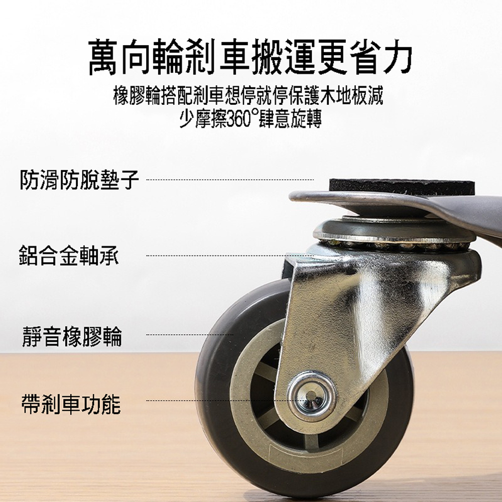 三角形萬向輪的中央凹槽可讓重物移動,表面柔軟,加厚防滑墊可有效防止物品損壞