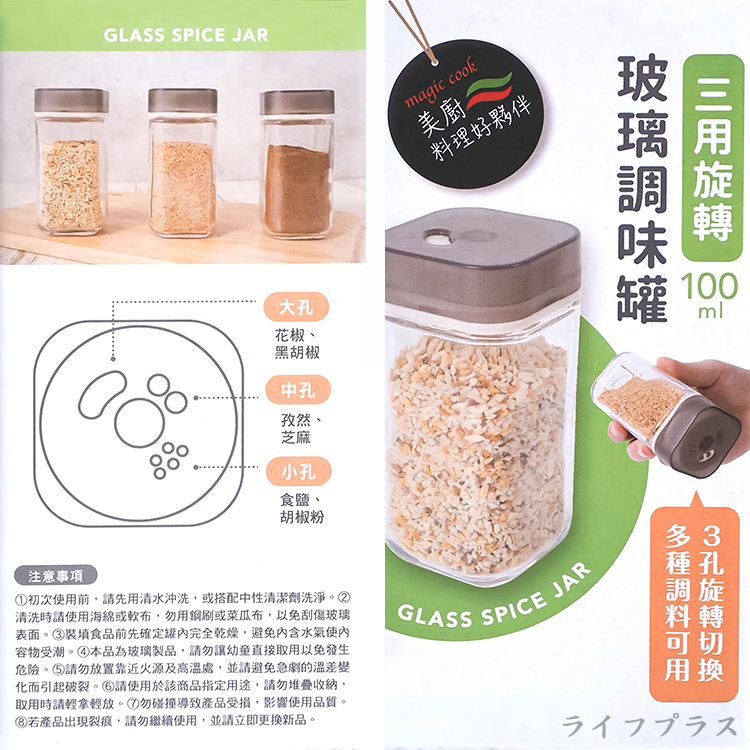 本產品通過SGS檢測,安心使用,盒蓋密合防止蟑螂螞蟻,三用旋轉設計,方便控制調味用量,玻璃罐身透明看的見,可放各式調味料。