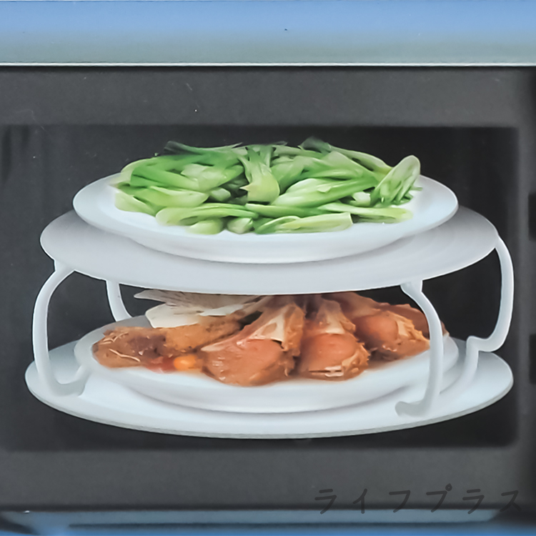 台灣製造品質安心 ,環保節能,可重覆使用,使用便利,清洗容易,底部可置放19cm以內碗盤,上方可置放空間23cm以內碗盤,多用途使用,可同時微波加熱兩道菜,也可以腳架朝上做防燙端盤使用。