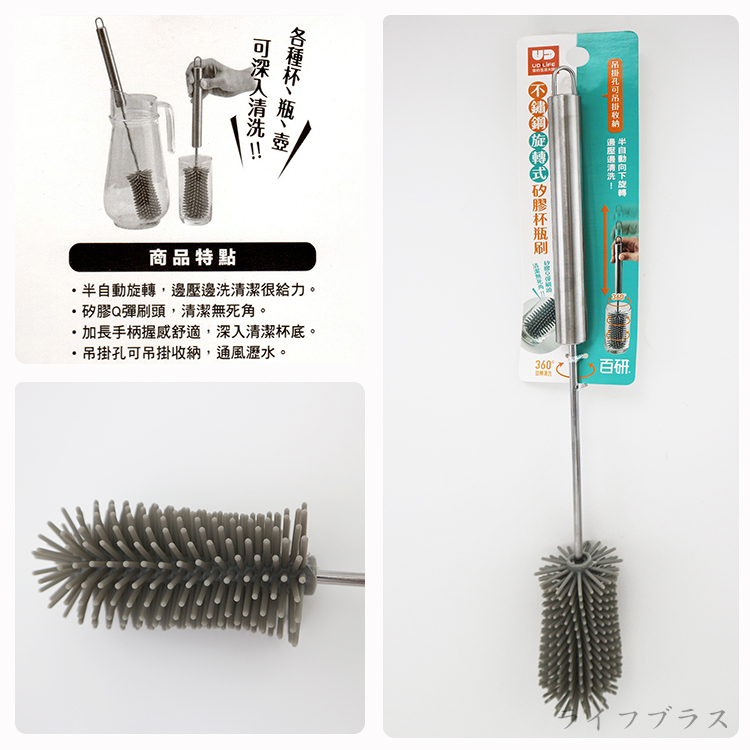 通常清洗杯子時,如果使用的是長型的杯子像是高腳杯、玻璃瓶其杯底總是不易清洗老是得將手塞進窄窄的杯口,然後將寶貝的雙手弄得又紅又痛其實不需要這麼辛苦,這款洗杯刷可以輕鬆的解決這個問題,讓你清洗無煩惱,獨特加長旋轉式設計,輕鬆清潔每個角落,特別是瓶口窄小根本無法清洗的杯子、瓶子、奶瓶、隨身攜帶的水瓶...等洗不到的難題迎刃而解。