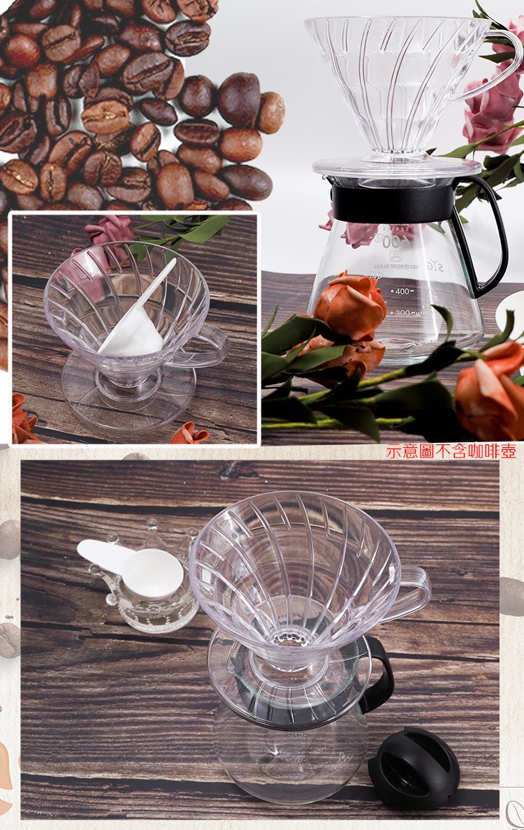 臺灣製造SGS檢驗合格,1~4人適用,附標準咖啡杓,搭配錐形濾紙過濾咖啡粉的殘渣,PP樹脂製造,耐熱120度,安心使用。