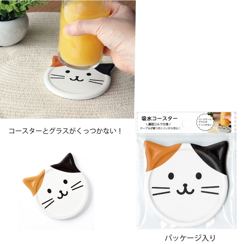 可愛三花貓圖案陶瓷杯墊,採用高吸水陶瓷材質搭配軟木底座,能快速吸收水滴並防止桌面留下水漬。