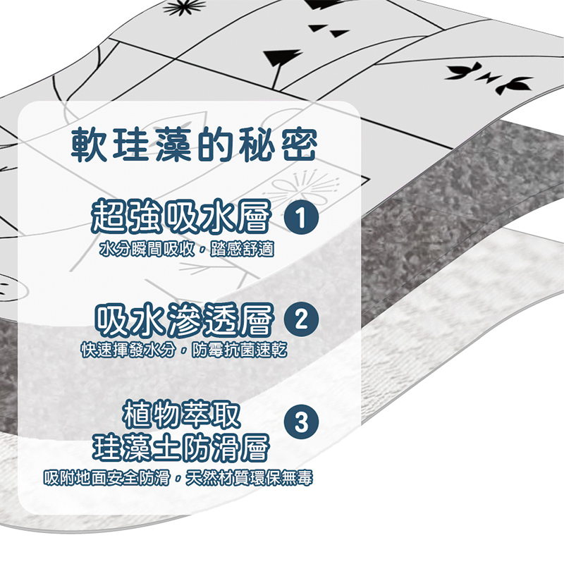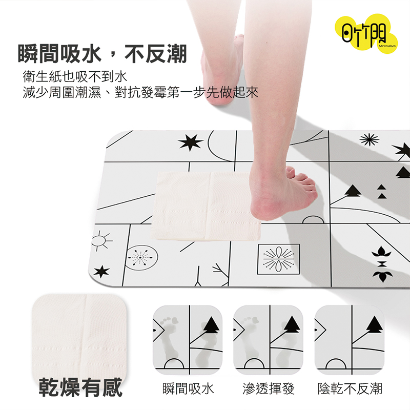 表層瞬間吸水材質,底層止滑效果佳。清潔保養輕鬆、簡單。