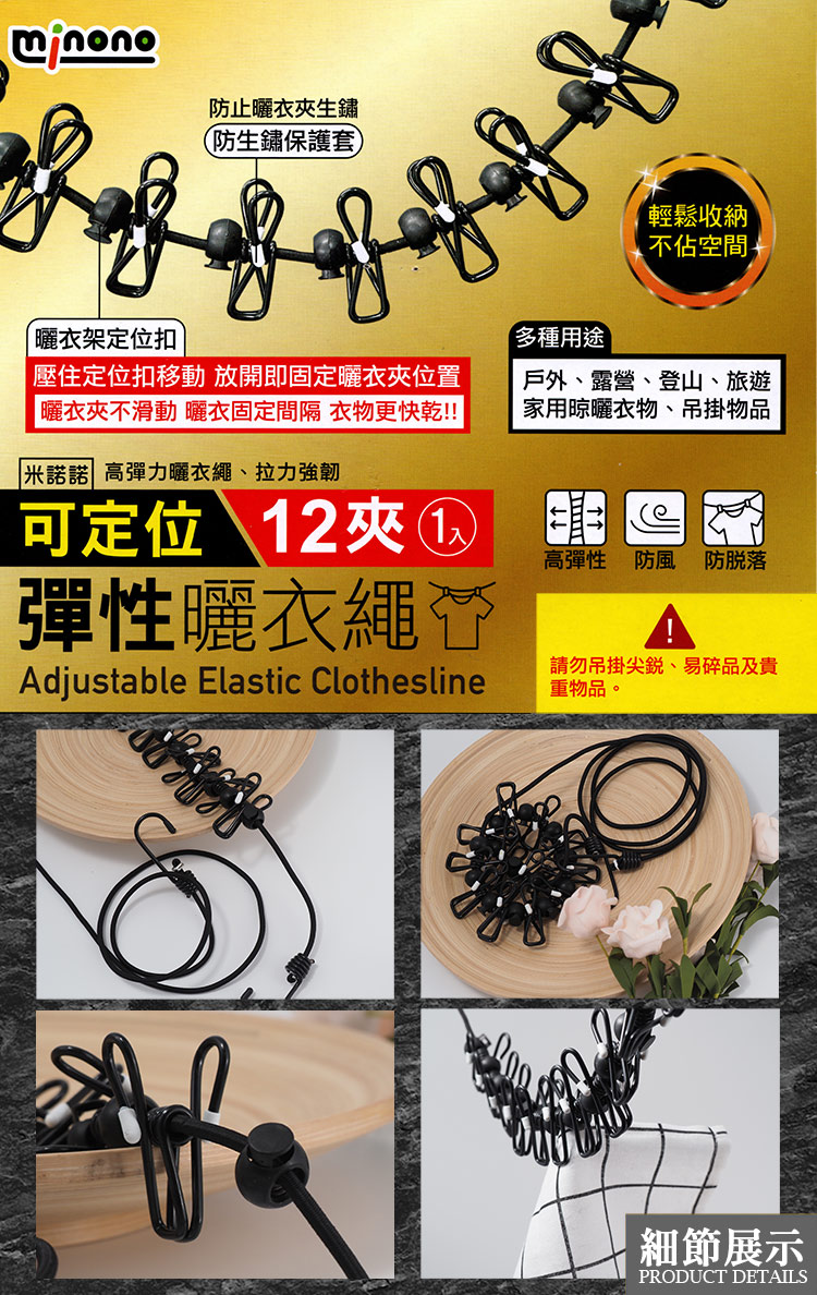 米諾諾可定位彈性曬衣繩-12夾-2入