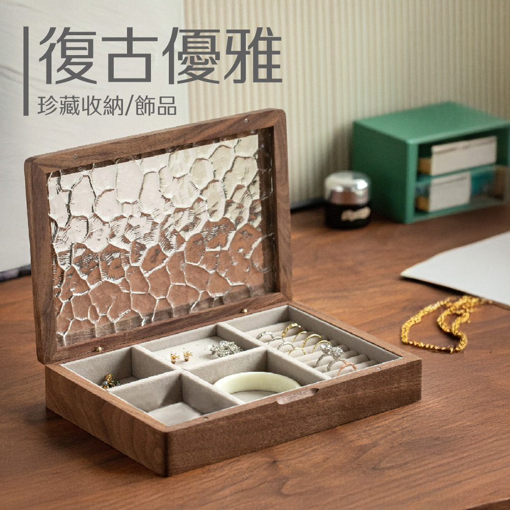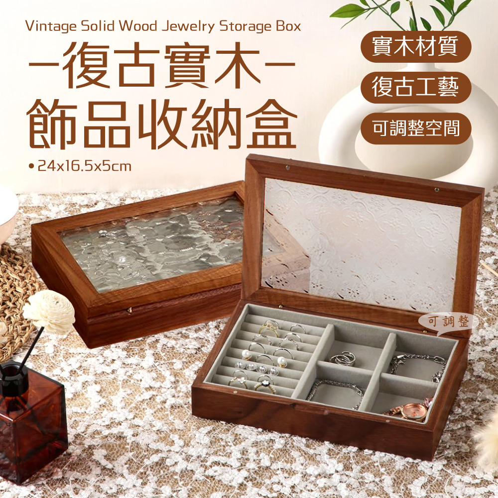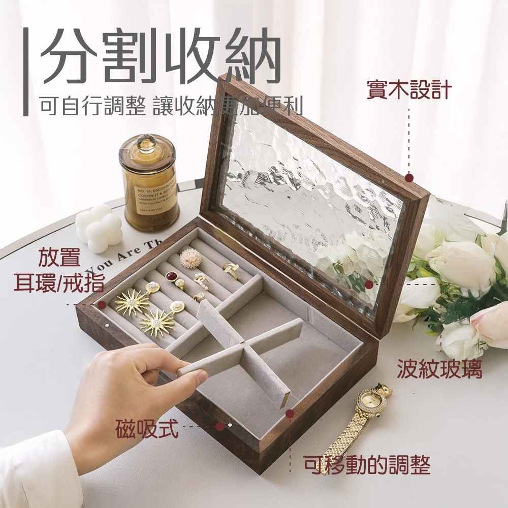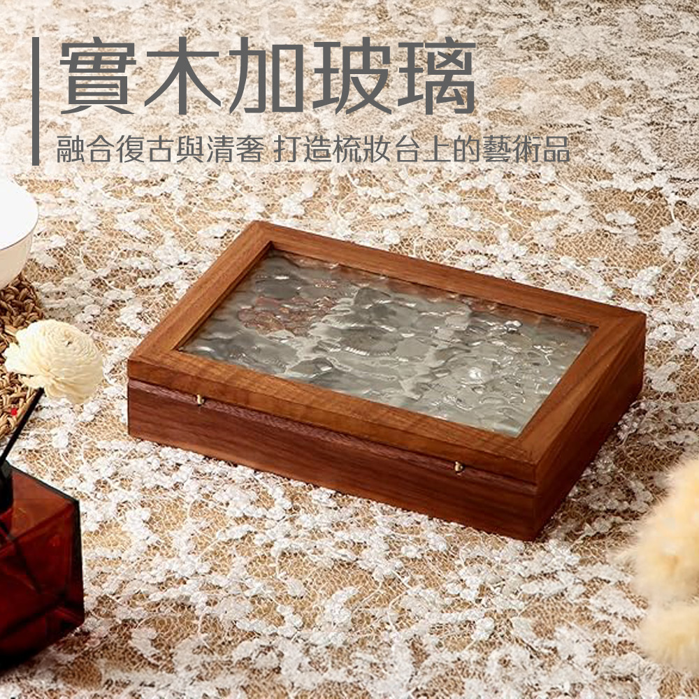 🪵 復古實木飾品收納盒商品規格:📏 尺寸:24x16.5x5cm⚖️ 重量:約765g🎨 款式:海棠玻璃/波紋玻璃精緻特色:天然木蠟油塗層,觸感細膩可拆卸隔板設計,自由調整優質天鵝絨內襯,保護珍品透明玻璃蓋面,展示一覽無遺精緻黃銅合頁,開合順暢收納空間:✨ 戒指凹槽設計✨ 耳環專用收納區✨ 項鍊手鍊隔層✨ 手錶獨立空間✨ 可調整大型區域完美融合實用性與藝術感,為你的珍貴飾品打造一個專屬的家。不只是收納盒,更是梳妝台上的精品藝術品!