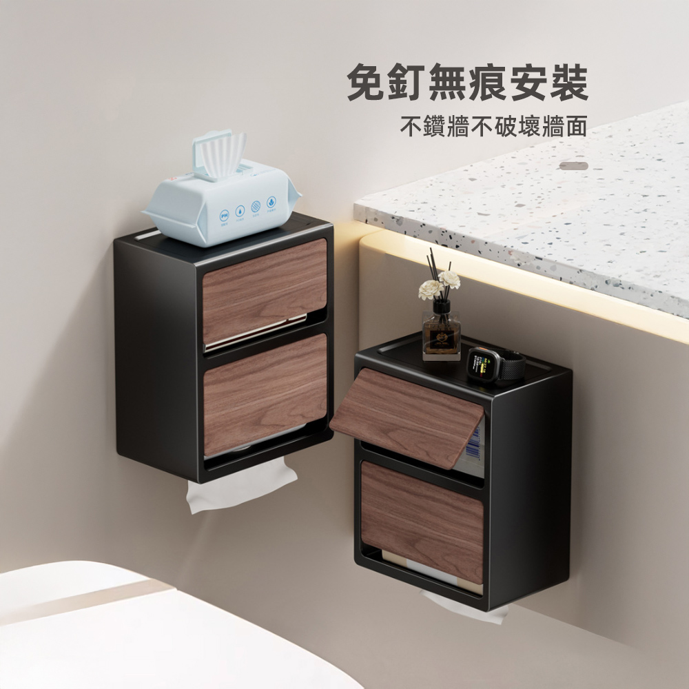 這款雙層壁掛面紙盒,採用免釘無痕安裝,不傷牆面,輕鬆收納各式面紙。上層可放置濕紙巾、手機等小物,下層抽取衛生紙更順手。告別雜亂,讓浴室空間更乾淨整潔,這款面紙盒特別適合小坪數浴室,解決檯面空間不足的困擾。