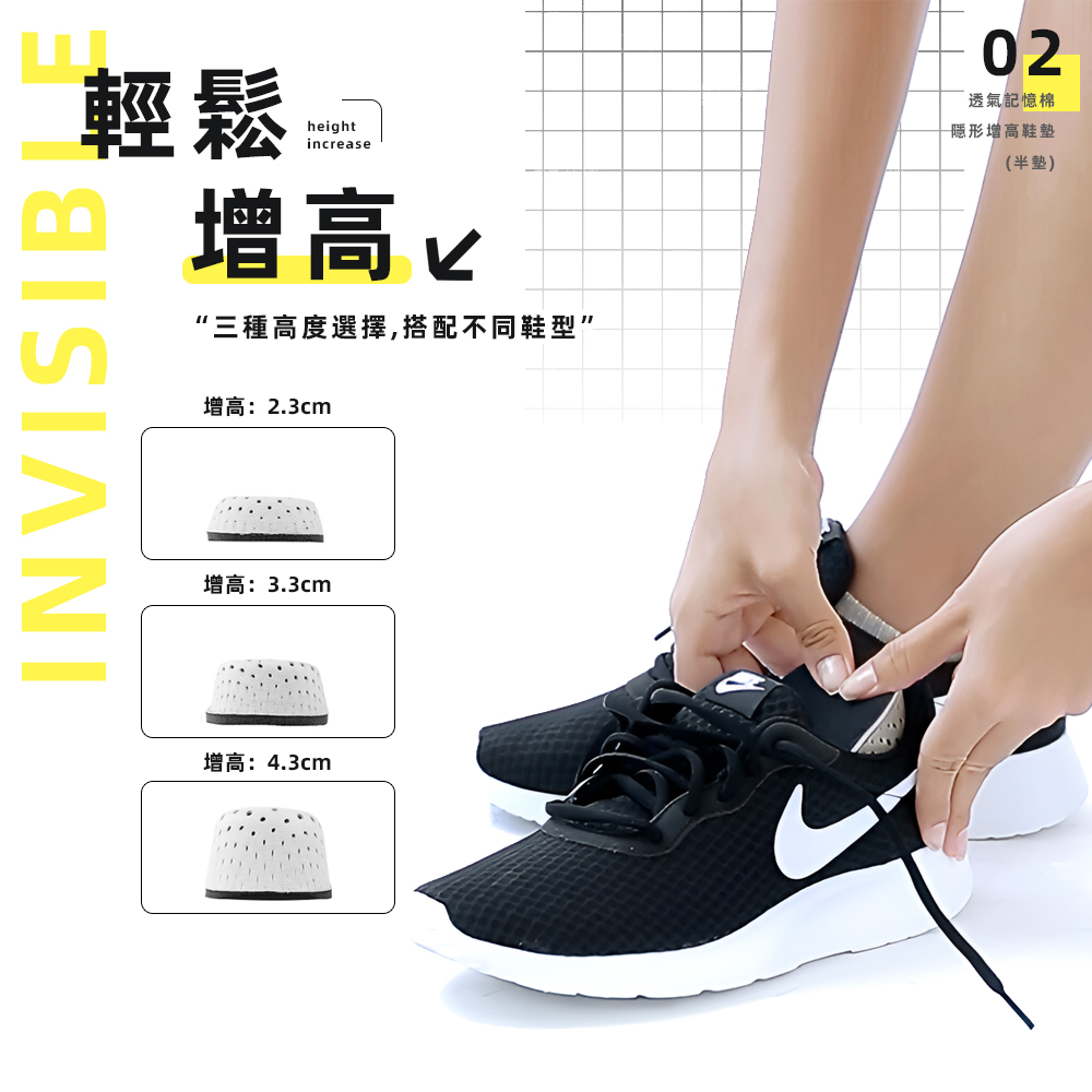 這款隱形記憶棉增高半墊,專為希望自然增高的人設計,能輕鬆放入各式鞋款,解決穿搭比例不佳的困擾,同時保有舒適的腳感,讓您每一步都更自信。
