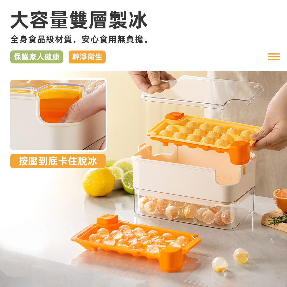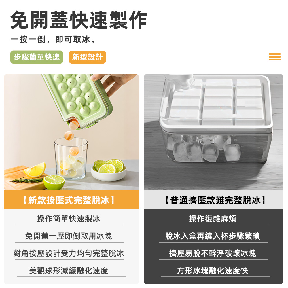 這款按壓式冰球製冰盒,特別適合喜歡在家自製飲品的你,解決了傳統製冰脫模困難、容易沾染細菌的困擾。只需將冰格反蓋於儲冰盒上,輕輕一按,冰球便完整落下,全程免接觸,讓每一次的清涼享受都更加純淨衛生。