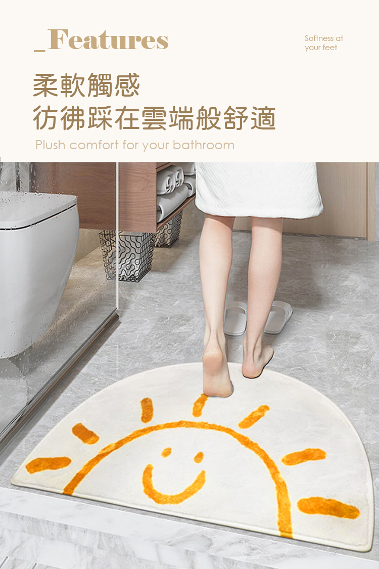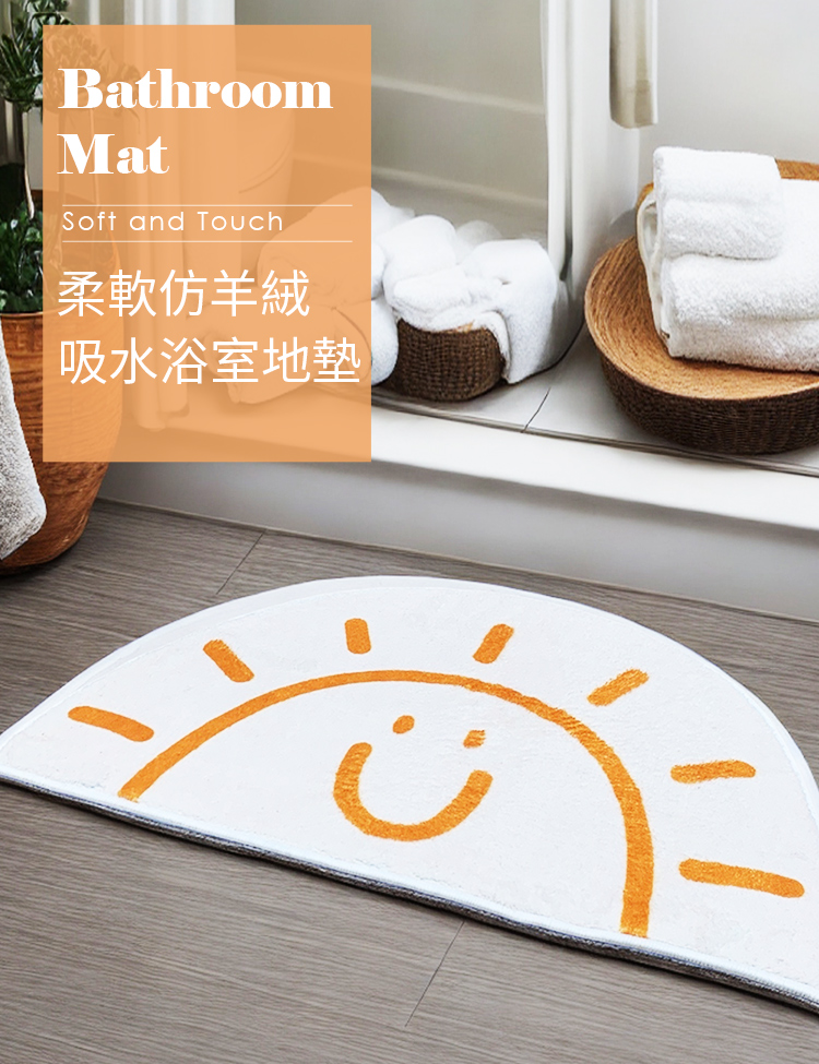 這款微笑太陽半圓地墊特別適合想為衛浴空間增添溫暖的人,它不僅能快速吸乾腳底水珠,仿羊絨的柔軟觸感更能解決出浴時踩到冰冷地板的不適感。可愛的笑臉為空間注入活力,讓每天的開始都充滿好心情。