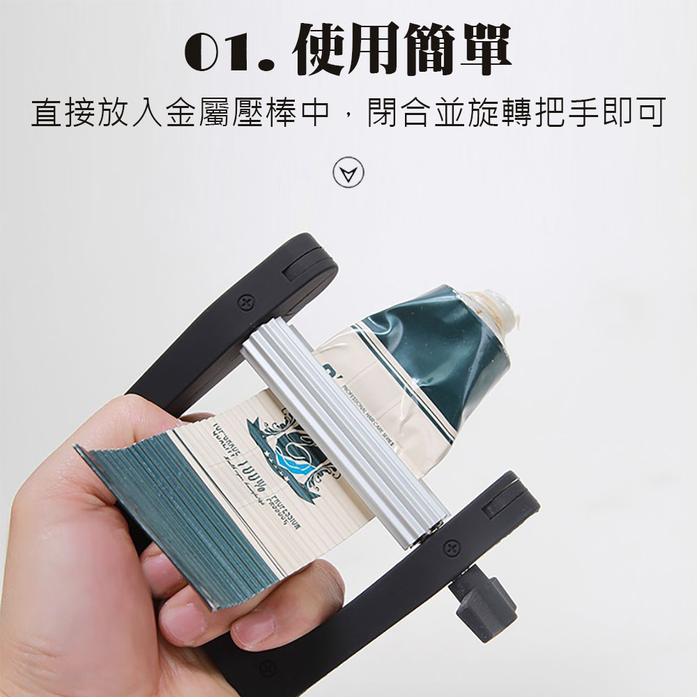 可用於染膏、牙膏、顏料等各種塑料管裝物品輕巧,設計簡便,舒適手感,順暢感受經濟時代,我們可以生活的更經濟哦!高10cm 寬10cm 金屬滾輪部分長7.5cm只需要把您所需要擠壓的塑料管裝物品放到兩個金屬管之間,再輕輕扭動旁邊的小把手,就OK啦!再也用自己用手艱難的擠壓了轉動就可以【尺寸說明】 《黑座+鋁合金滾輪》 外框-10*10cm 滾輪-7.5cm 《全鋁合金》 外框-8.6*9.5cm 滾輪-8cm