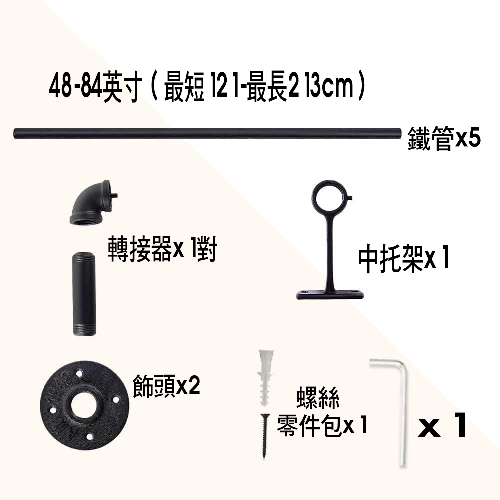鐵管x5、中托架x1、飾頭x2、轉接器x1對、螺絲零件包x1