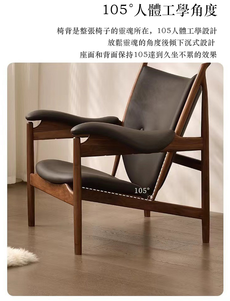 酋長椅|丹麥設計經典FAS 級北美黑胡桃木 × 105° 人體工學|收藏級單椅FAS 級白蠟木 × 105° 人體工學|性價比單椅✔ 全球最具代表性的 15 把大師椅之一✔ 丹麥設計之父 Finn Juhl 經典之作✔ 100% 純實木・拒絕貼皮與人造板🏆 設計背景|不是仿款,是經典原型1949 年,由「丹麥設計之父」Finn Juhl與工藝大師 Niels Vodder 聯手打造。📌 被譽為丹麥現代主義代表作📌 收藏家、設計師、建築師指定單椅這是一張被寫進設計史的椅子。🌳 用料說明|只用真正的好木頭北美進口 FAS 級黑胡桃木,整體結構 100% 純實木北美進口 FAS 級白蠟木,筆直清晰,清爽現代不用貼皮、不用人造板,大板直拼,從源頭拒絕甲醛📌 每一把胡桃木木紋皆不同📌 天然差異=獨一無二🔸 水滴紋|溫潤柔和🔸 波浪紋|流動自然🔸 鳥啄紋|稀有獨特🔸 大山紋|層次立體🔸 直綫紋|經典耐看🔸 金瘤紋|端莊大氣木蠟油塗裝|保護木頭,也保留質感植物性木蠟油塗裝,深入木材纖維,非表面上漆保留實木觸感與自然呼吸感✔ 紋理更清晰✔ 色澤更溫潤✔ 越用越好看🛋 坐感設計|久坐不累的關鍵▸ 105° 人體工學後傾坐面與椅背維持黃金角度背部自然貼合,久坐不壓迫▸ 55cm 超寬坐深正坐、斜坐、盤坐都舒適馬鞍式寬扶手:完整承托手臂真皮包覆坐墊:觸感細膩、支撐到位高密度回彈海綿:不塌陷、不疲乏✅ 適合誰購買?✔ 想找一張「能坐很多年」的單椅✔ 重視設計感與空間質感✔ 不想買大量感工業家具✔ 喜歡實木、皮革與手工細節📦 購買提醒(常見 QA)本商品為 天然實木,木紋與色澤略有差異屬正常現象皮革為真皮材質,隨使用會產生自然使用痕跡