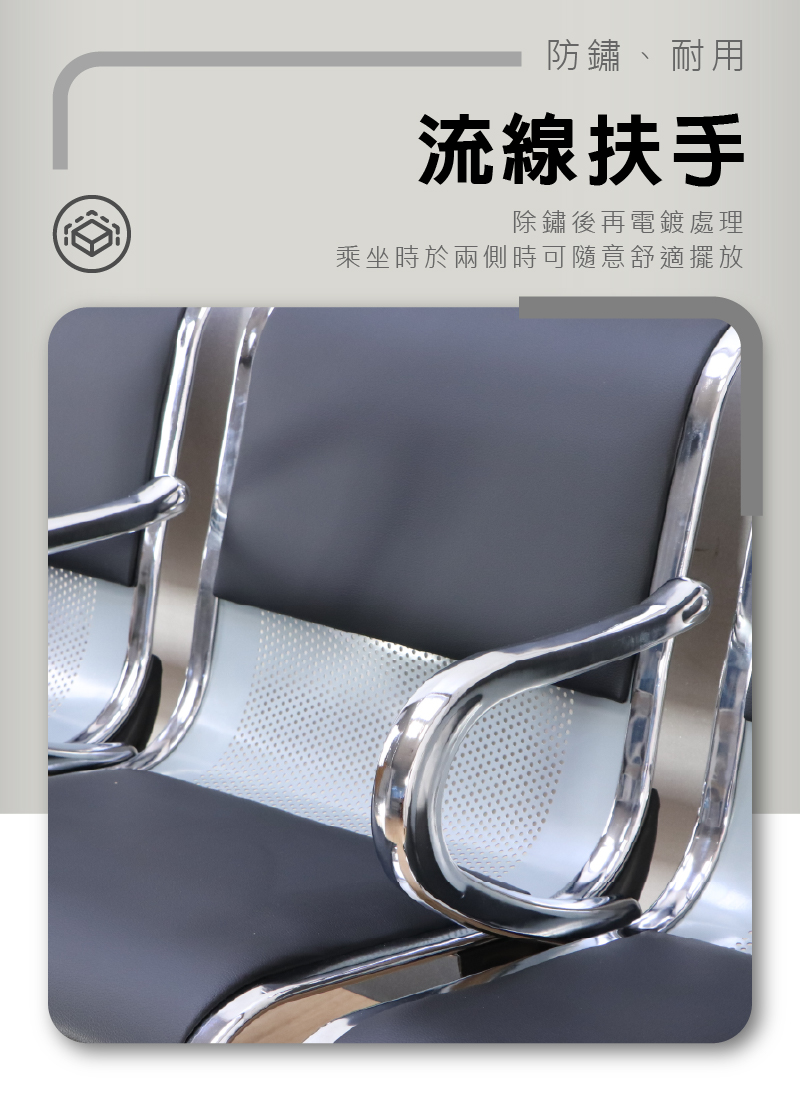 ★防鏽、防靜電、柔軟舒適座椅座板使用進口加厚冷軋鋼板,除鏽後再靜電噴粉,具防靜電功能。★流線造型椅身椅座完美曲線,舒適貼合人體曲線,緩解您等候的疲勞。★涼爽不悶熱透氣孔設計透氣孔設計,清爽舒適,讓您等待時間不悶熱。★獨立座椅不緊黏獨立座椅,乘坐不緊黏、不干擾,保持禮貌且適當的舒適距離。★防鏽耐用扶手流線扶手,除鏽後再電鍍處理,乘坐時於兩側時可隨意舒適擺放。★防滑腳墊防滑腳墊,穩固不位移,且防止地板刮傷。★椅座加粗橫樑加粗橫樑,使用加硬鋼板,表面粉體烤漆,防鏽、承重力強。【商品】●內容物:黑皮革金屬排椅●商品顏色:銀色支架+黑色皮●材質:金屬、合成皮.......................................................二人款●尺寸:122 x 76 x 63cm (詳細如附圖)●外箱尺寸:橫桿箱:123x10x12 cm椅座箱:102x7x54 cm配件箱:35x8x56 cm扶手箱:35x8x14cm●外箱重量:共21.5kg橫桿箱:4.5kg坐墊箱:11.5kg配件箱:4.5kg扶手箱:1kg.......................................................三人款●尺寸:180 x 76 x 63cm (詳細如附圖)●外箱尺寸:橫桿箱:181x10x12cm椅座箱:102x12x54cm配件箱:35x8x56cm扶手箱:35x8x28cm●外箱重量:共32kg橫桿箱:6kg坐墊箱:18kg配件箱:6kg扶手箱:2kg..................................................................四人款●尺寸:235 x 76 x 63cm (詳細如附圖)●外箱尺寸:橫桿箱:227x10x12cm椅座箱:102x12x52cm配件箱:35x8x56cm扶手箱:35x8x42cm●外箱重量:共39kg橫桿箱:8kg坐墊箱:22kg配件箱:6kg扶手箱:3kg..........................................................................●組裝:商品須組裝●保養方法:抹布擰乾擦拭即可