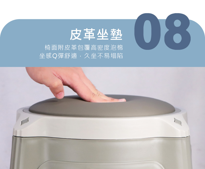 椅面附PU皮革包覆高密度泡棉,坐感Q彈舒適。