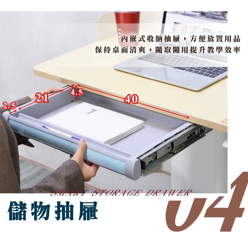 內嵌式收納抽屜設計,方便放置用品、筆記與文件,保持桌面清爽。