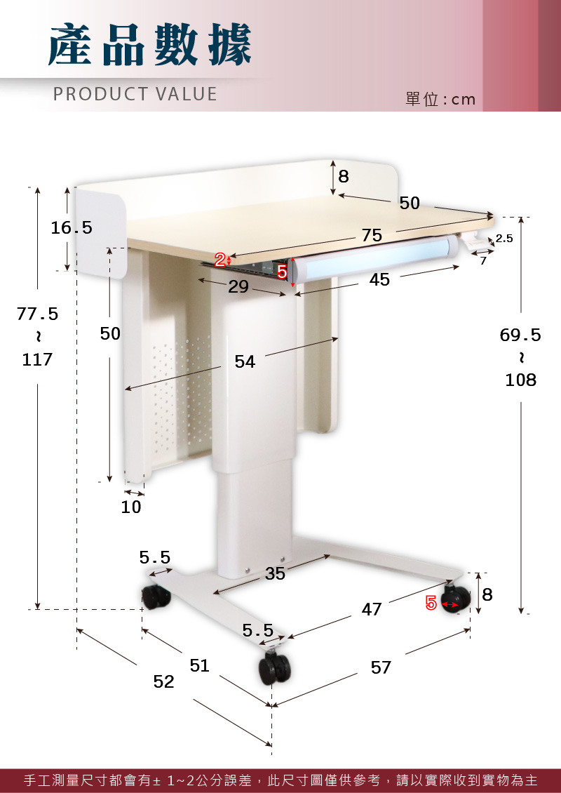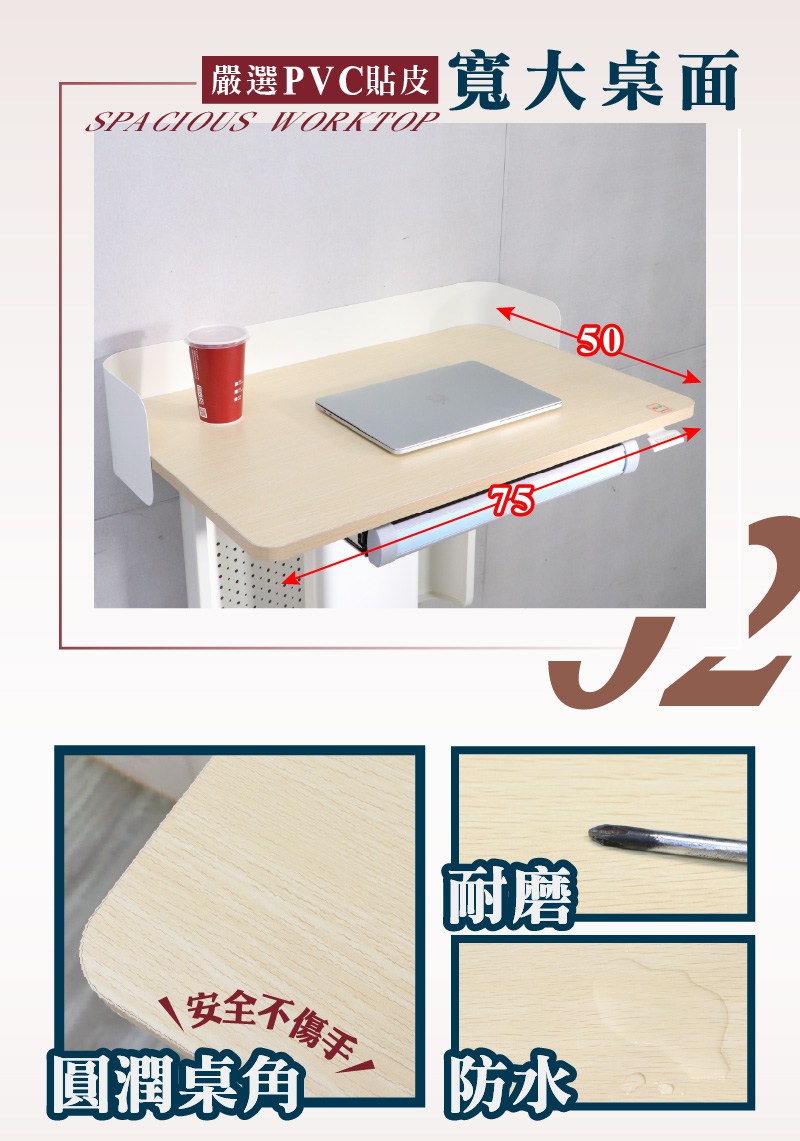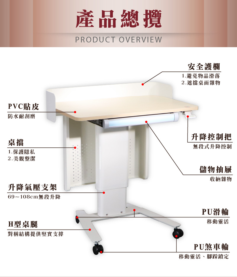 ●產品材質:支架材質:鐵管烤漆+PP塑膠抽屜材質:PP塑膠桌板材質:PVC、塑合板輪子材質:PU煞車輪(後輪)+PU滑輪(前輪)氣壓棒:無段升降防爆氣壓棒