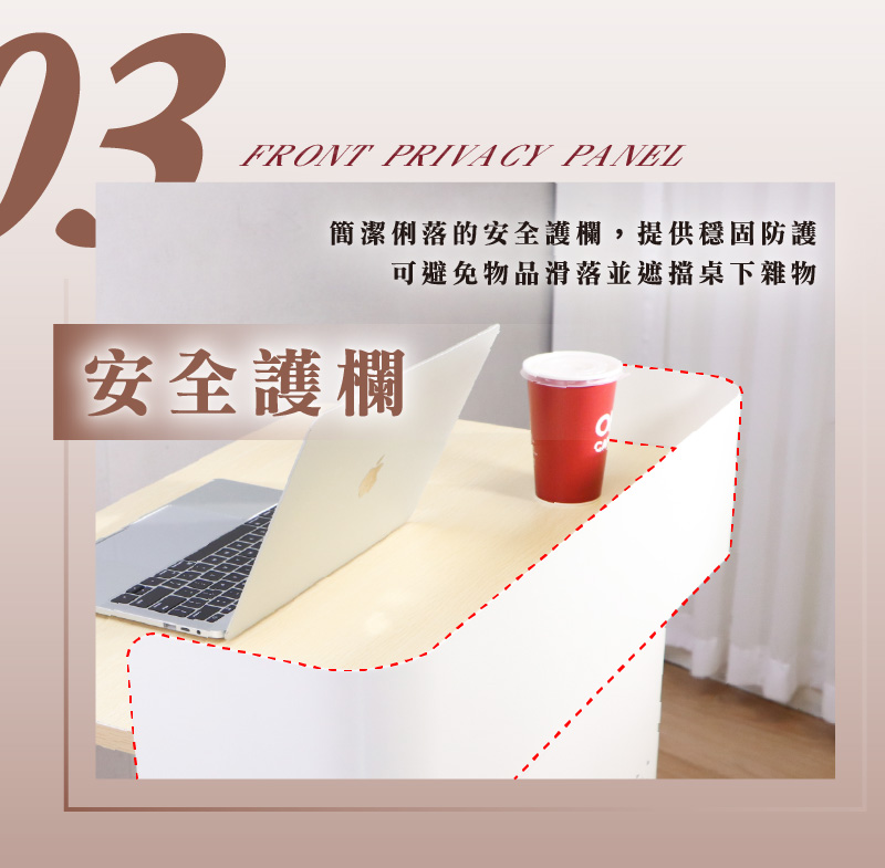 簡潔俐落的前擋板設計,提供穩固防護避免物品滑落,並兼遮擋桌下雜物,具隱私與美觀。
