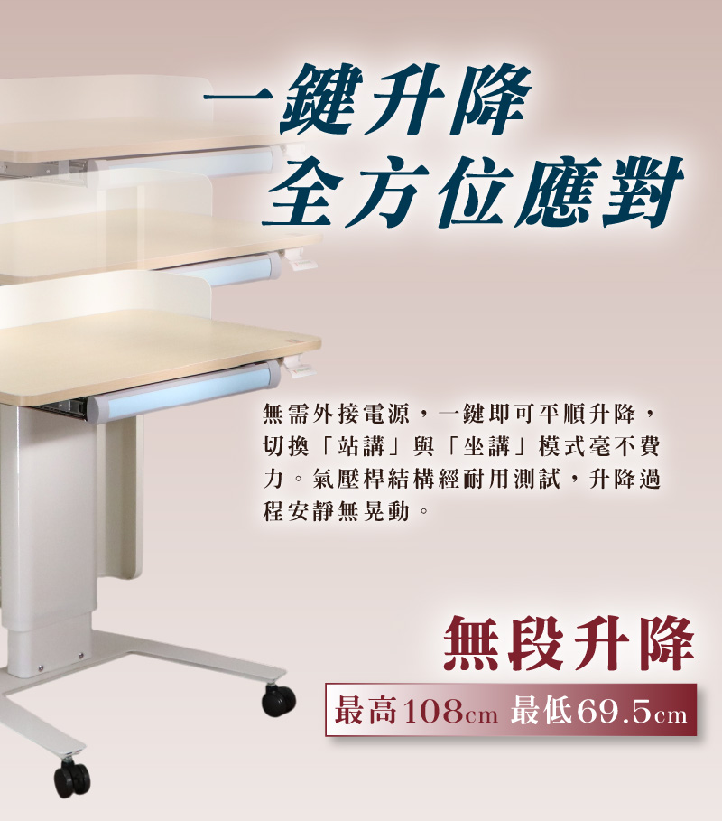 ★一鍵升降 | 68~107公分搭載平穩的線控氣壓升降系統,只需輕鬆一按即可自由調整高度,尋找最佳高度。