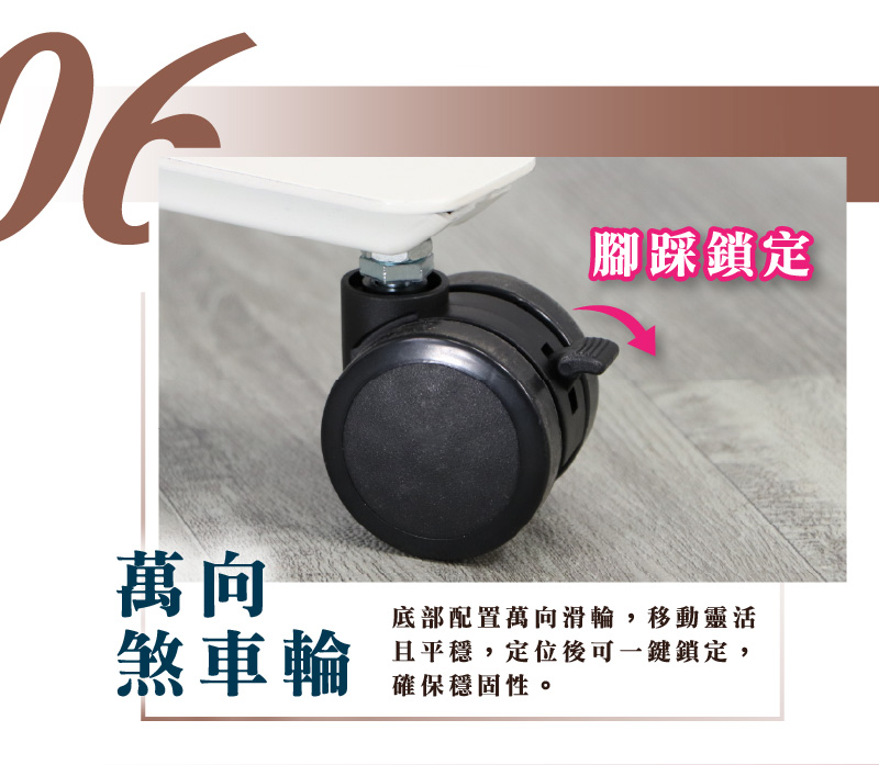 底部配置PU煞車滑輪,移動靈活且平穩,定位後可一鍵鎖定,確保穩定性。