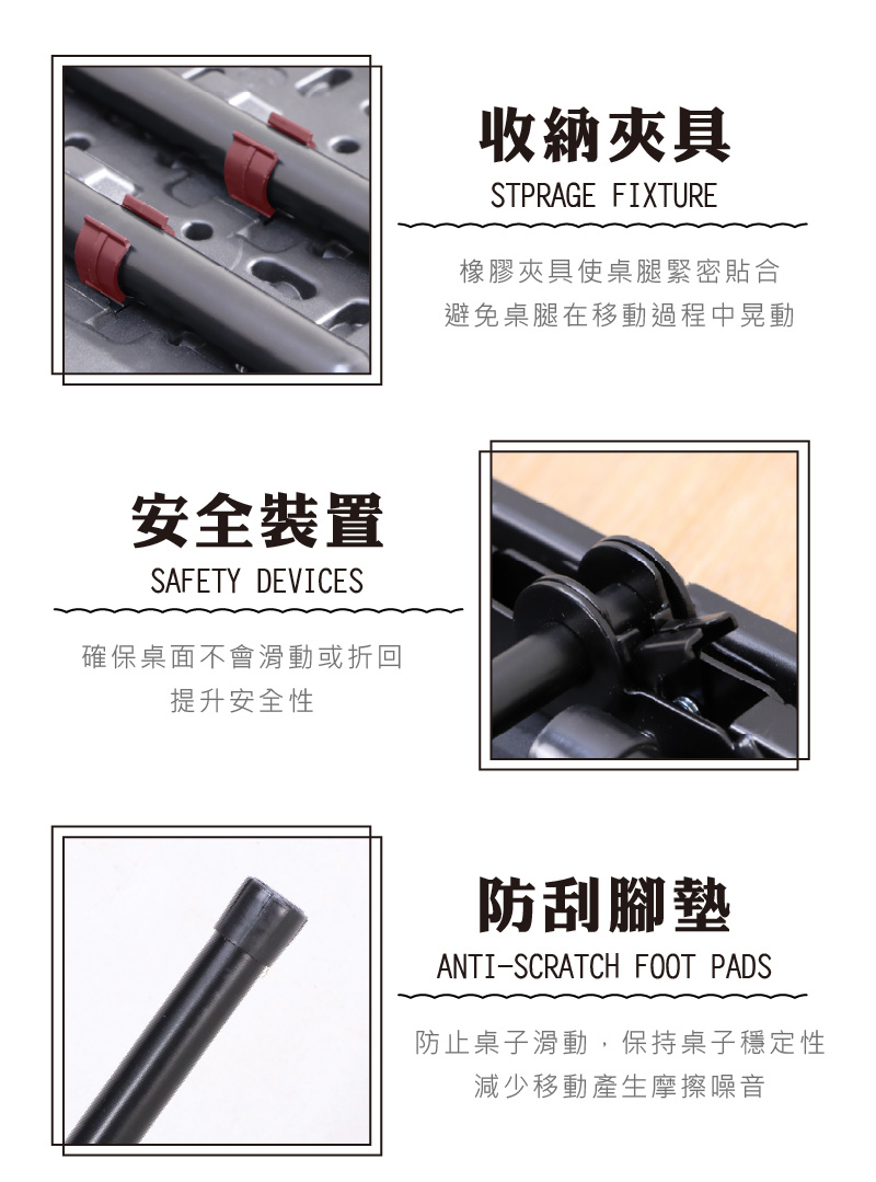 摺疊桌腿橡膠夾具使桌腿緊密貼合,避免桌腿在移動過程中晃動。